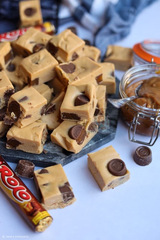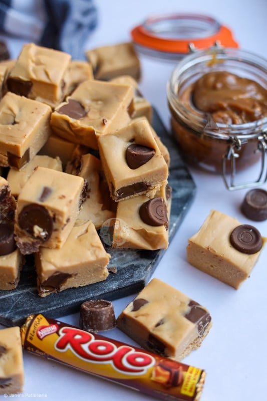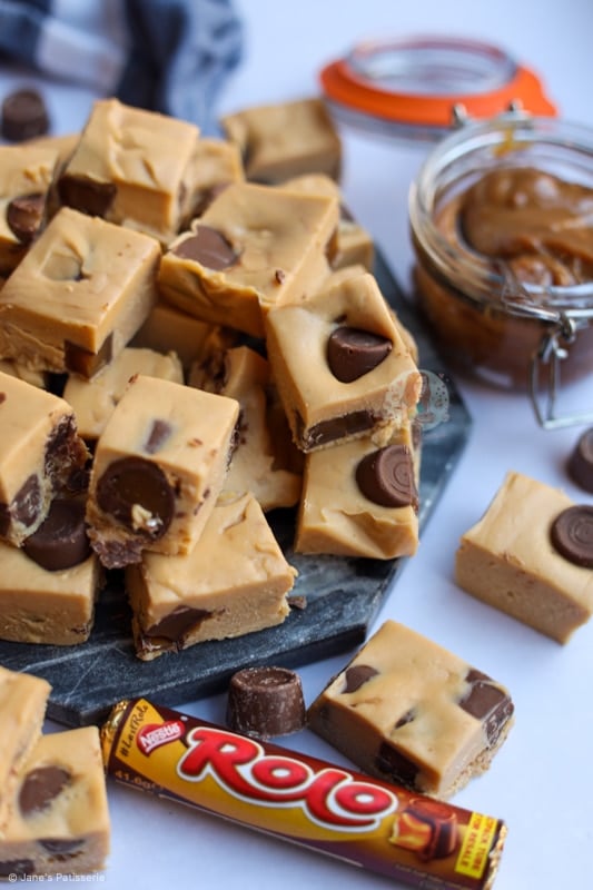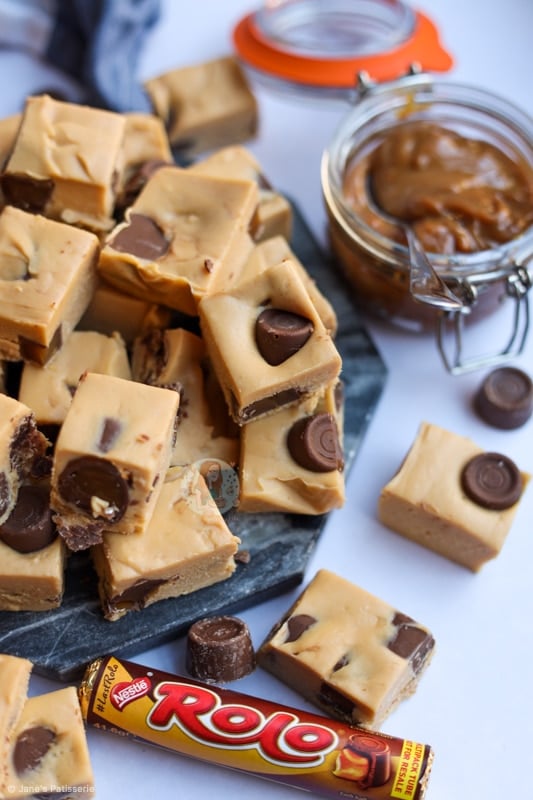 The same amount of chocolate for the tin size, and skipping the butter and vanilla.. and you had a winner. The Rolos give a nice chewy crunch in comparison to the fudge, and it’s basically the most delicious caramel fudge I have ever tried! *Not biased at all*.. But anyway, I hope you love this as much as I do!