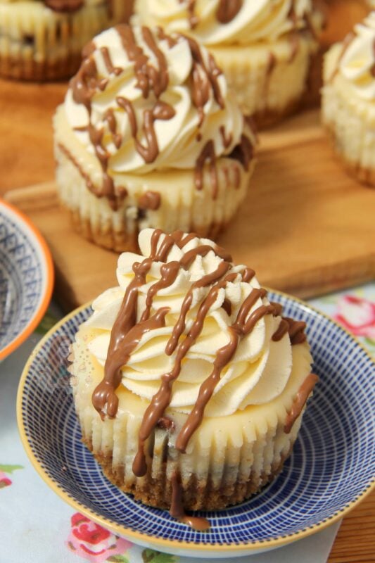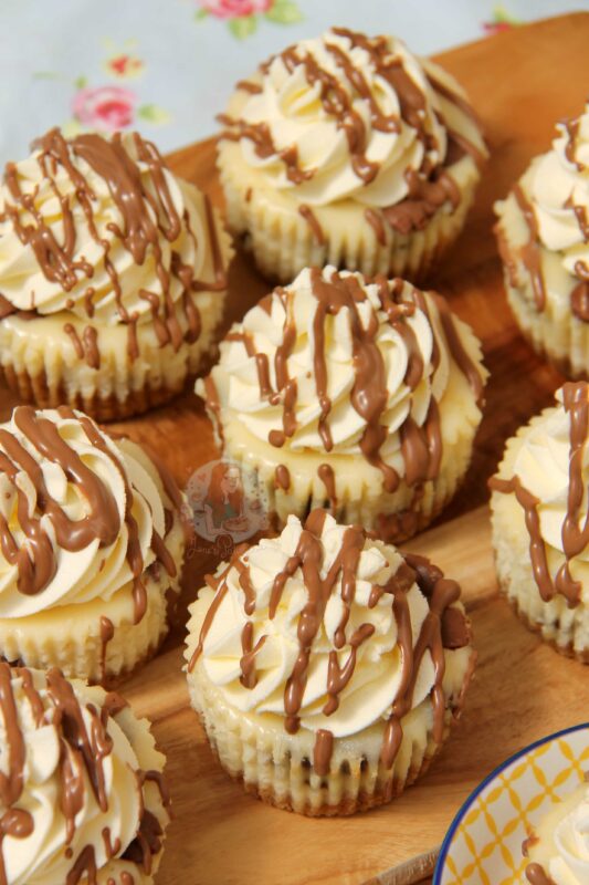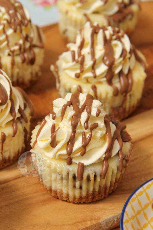 These little beauties have a biscuit base on the bottom, with a light and creamy vanilla cheesecake. In the cheesecake are some milk chocolate chips, with a swirl of whipped cream on top, and a drizzle of even more chocolate