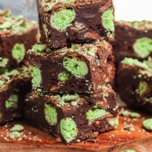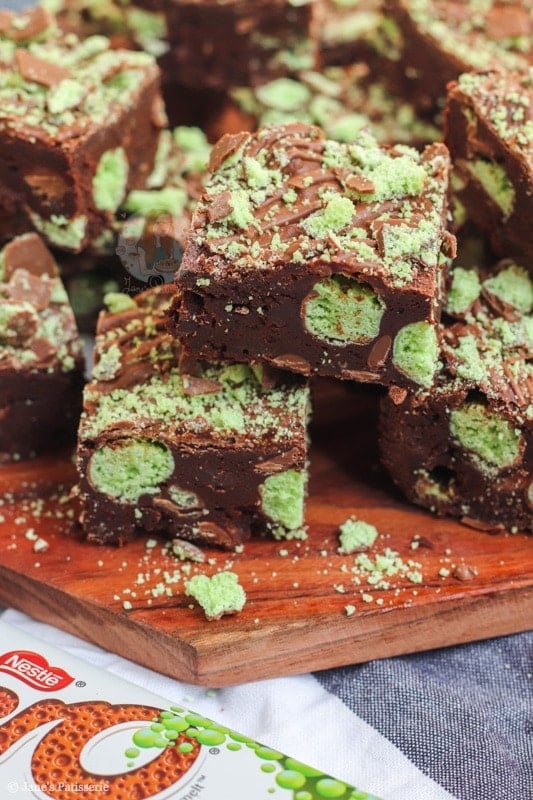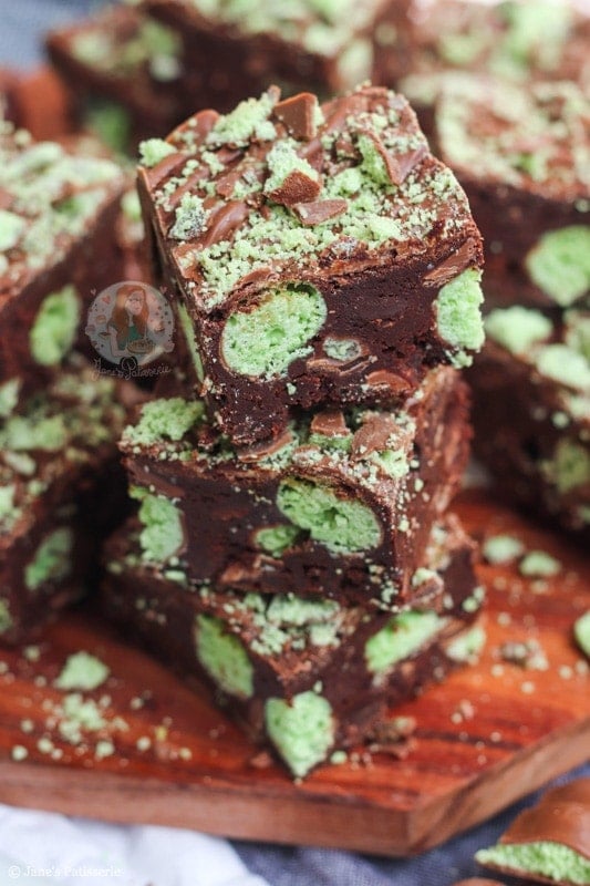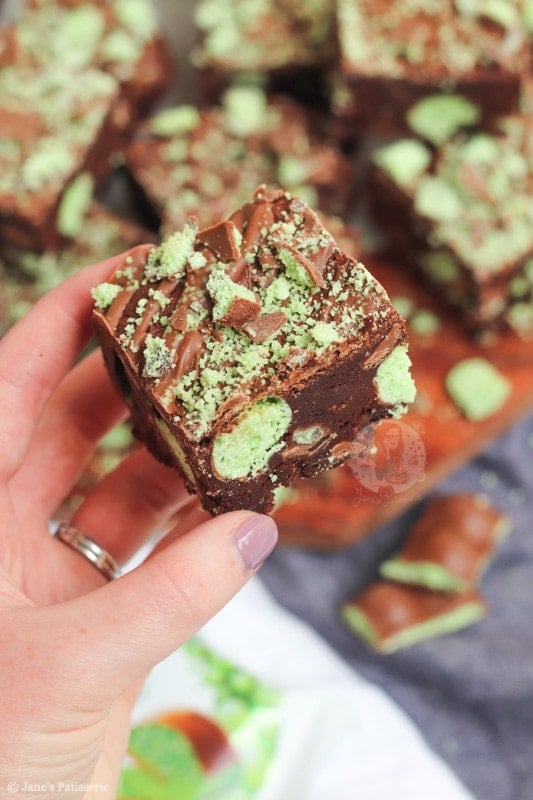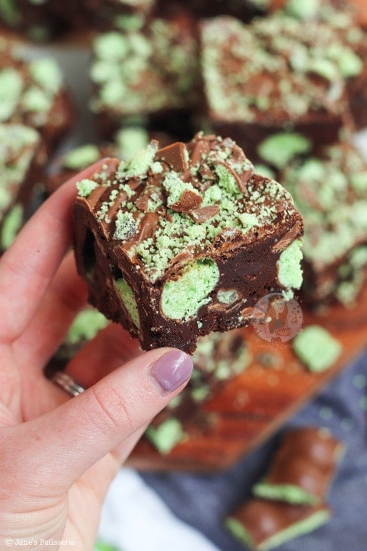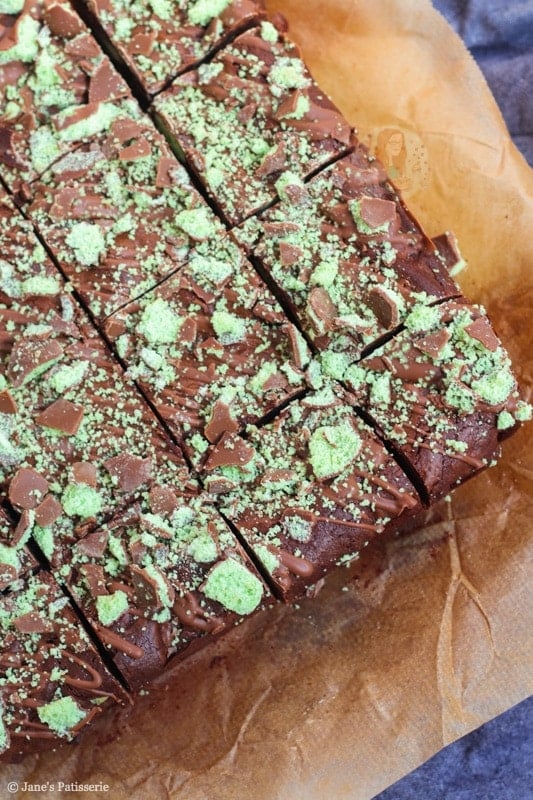 I baked mine till they wobbled slightly, let the tin cool, then decorated and put the brownies in the fridge overnight. Best fudgiest mint aero brownies ever! You don’t have to put them in the fridge at all, but it makes them easier to cut in my opinion, and creates that solid but gooey texture you want!