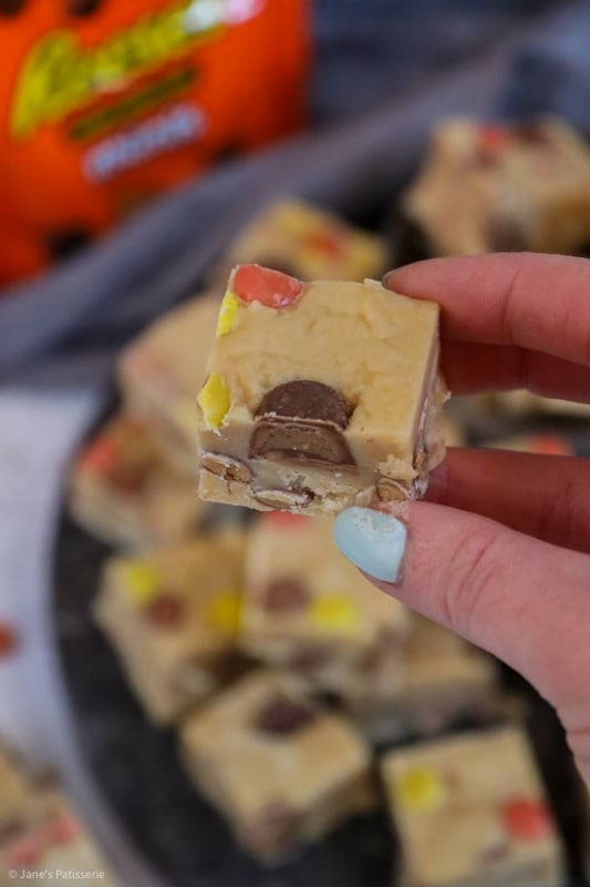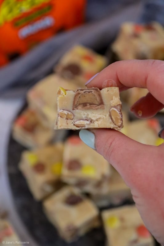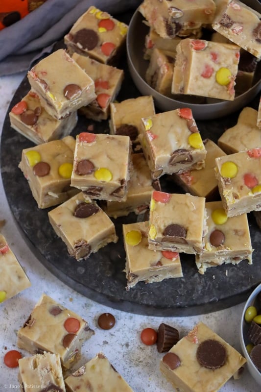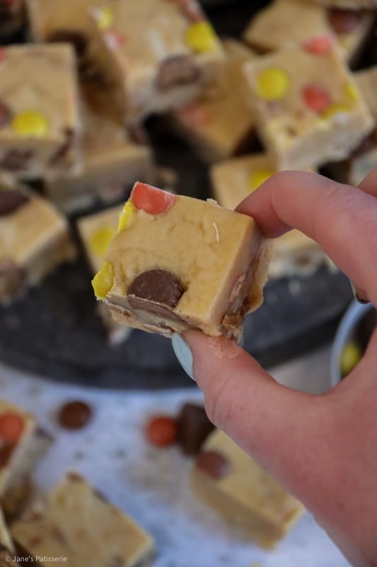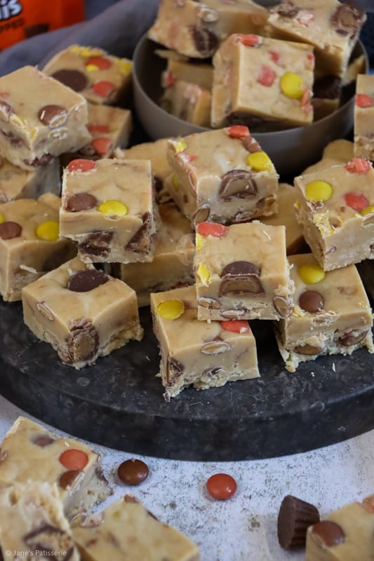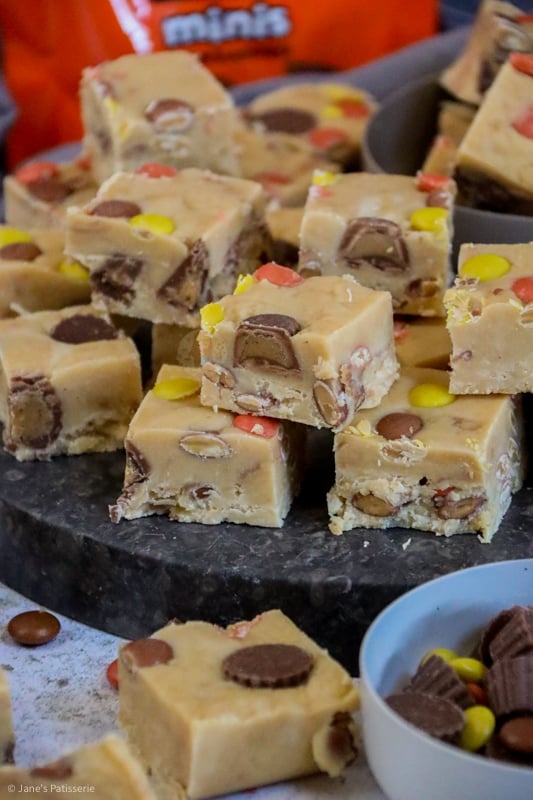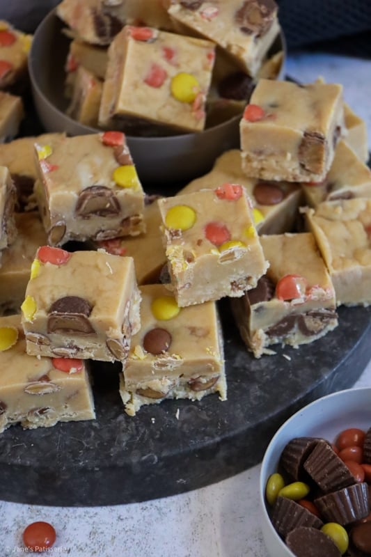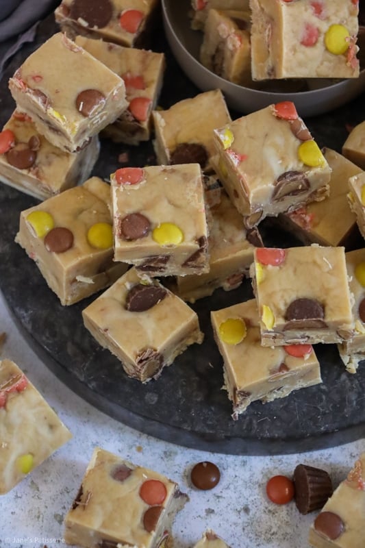 The original recipe was: 397g condensed milk, 300g white chocolate, 200g peanut butter, 25g unsalted butter, 100g icing sugar, 150g mini peanut butter cups, 150g Reese’s pieces.