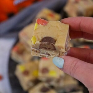 Easy & delicious peanut butter fudge with smooth chocolate, peanut butter and lots of Reese’s treats – so good.
