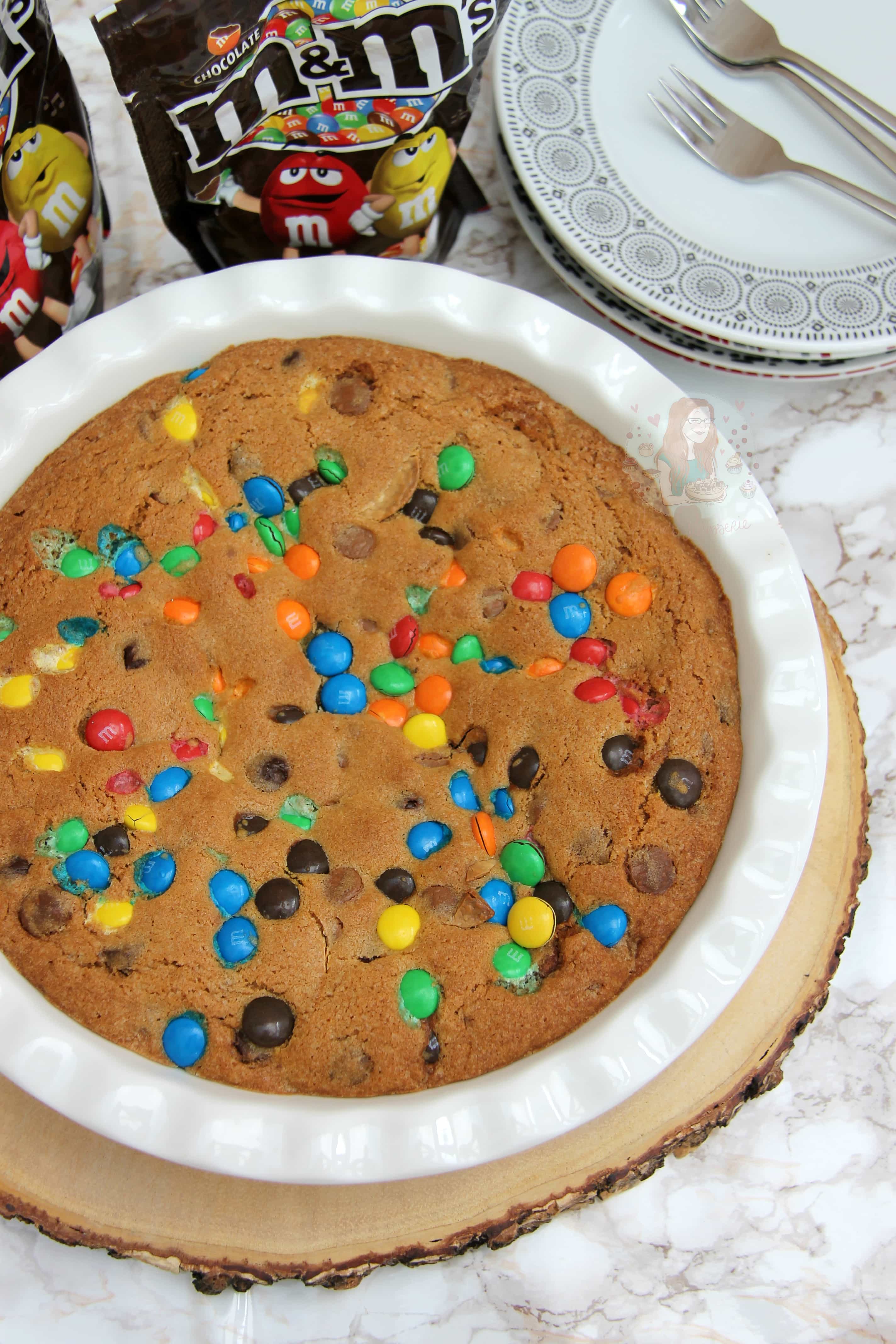- Add in 85% of your M&Ms and fold them through. Spread the cookie dough into the pie dish, and add the last of the sweets on top for decoration. You don’t have to do this, but I think it looks far nicer!
