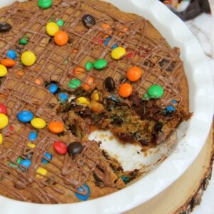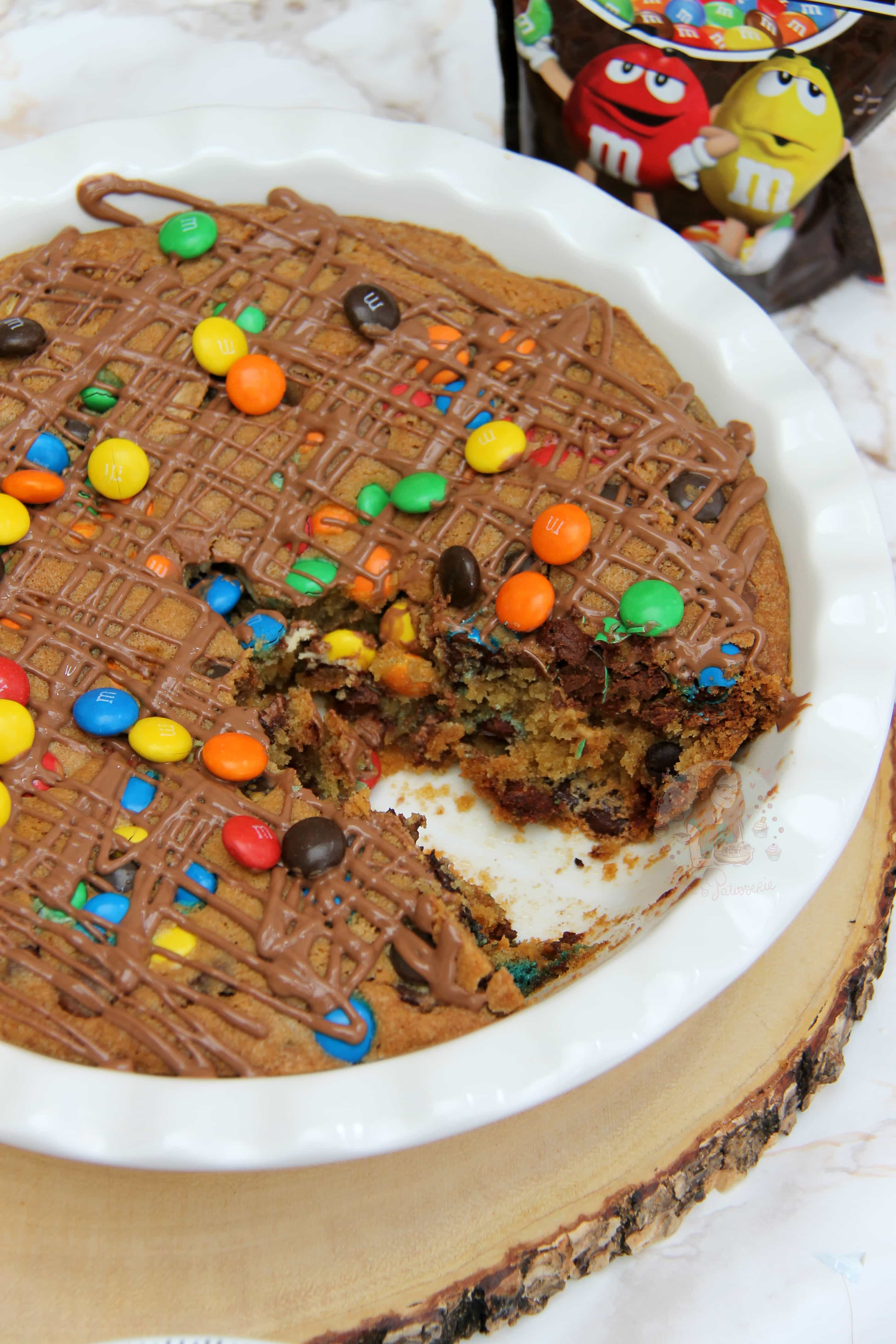 This recipe is similar in style to my Chocolate Chip Skillet Cookie as its basically a giant cookie baked in something (rather than a cake tin) and its beautiful. I’m sure this recipe would work in a cake tin, like with my Triple Chocolate Cookie Cake, but I adore it in the Pie dish. Something about baking in a dish like this makes it taste different and the texture different to a tin. But honestly, I have tried this with so many different chocolatey sweets that I didn’t really specify in the recipe, I just simply stated which ones I used in the Recipe Tutorial video and in the photos.
