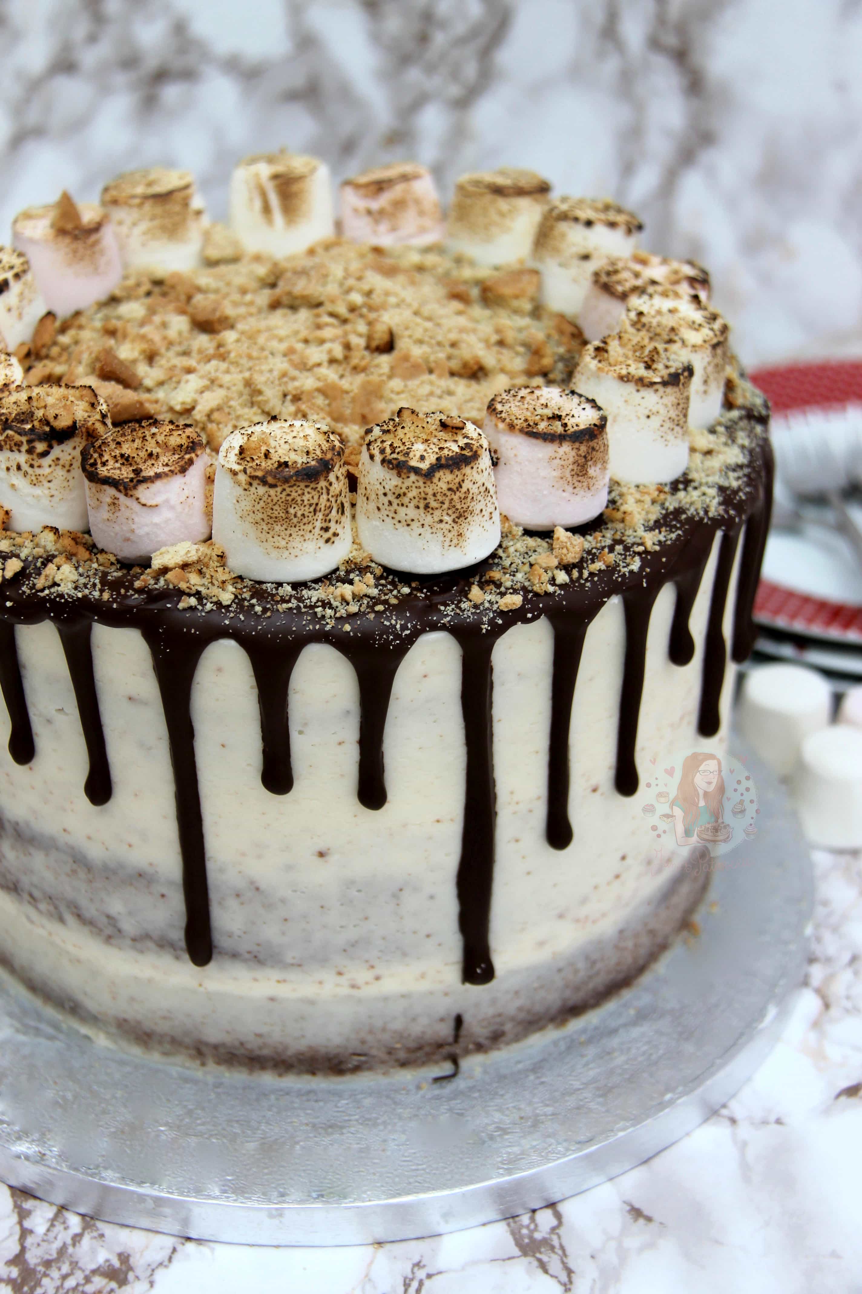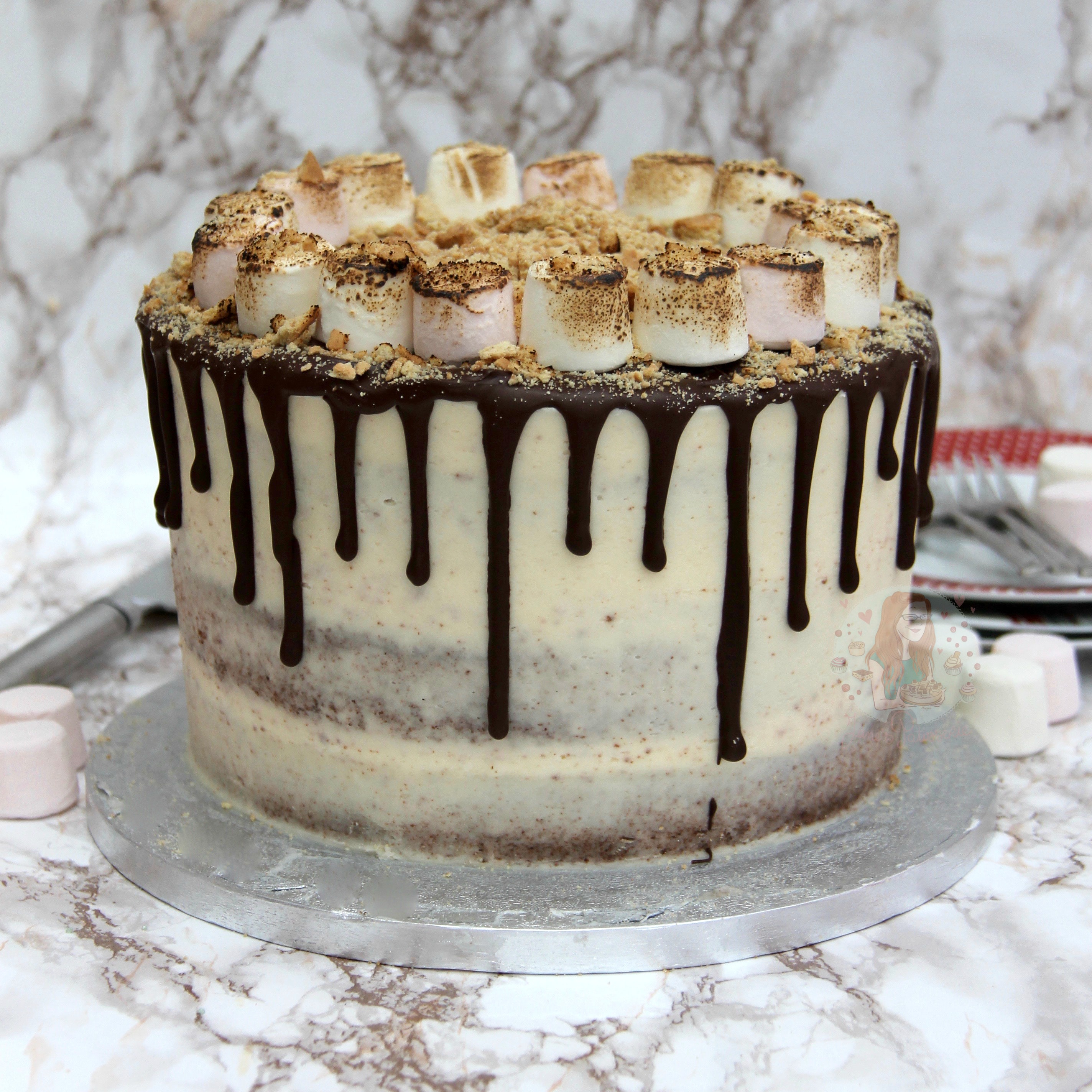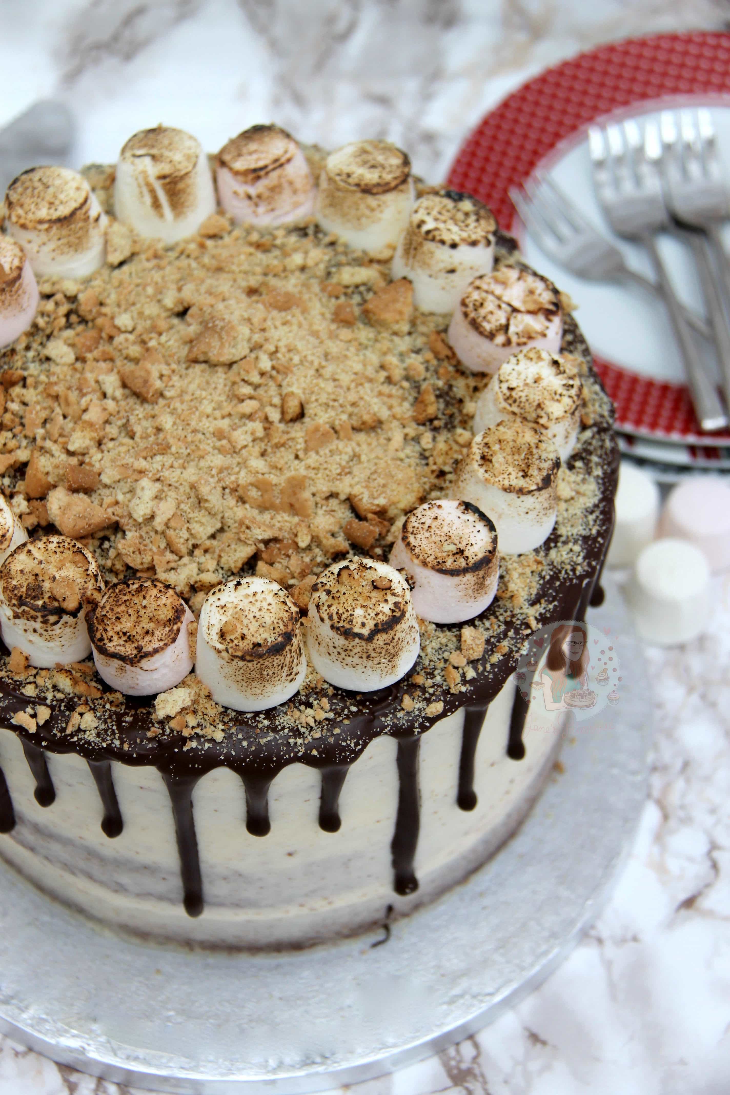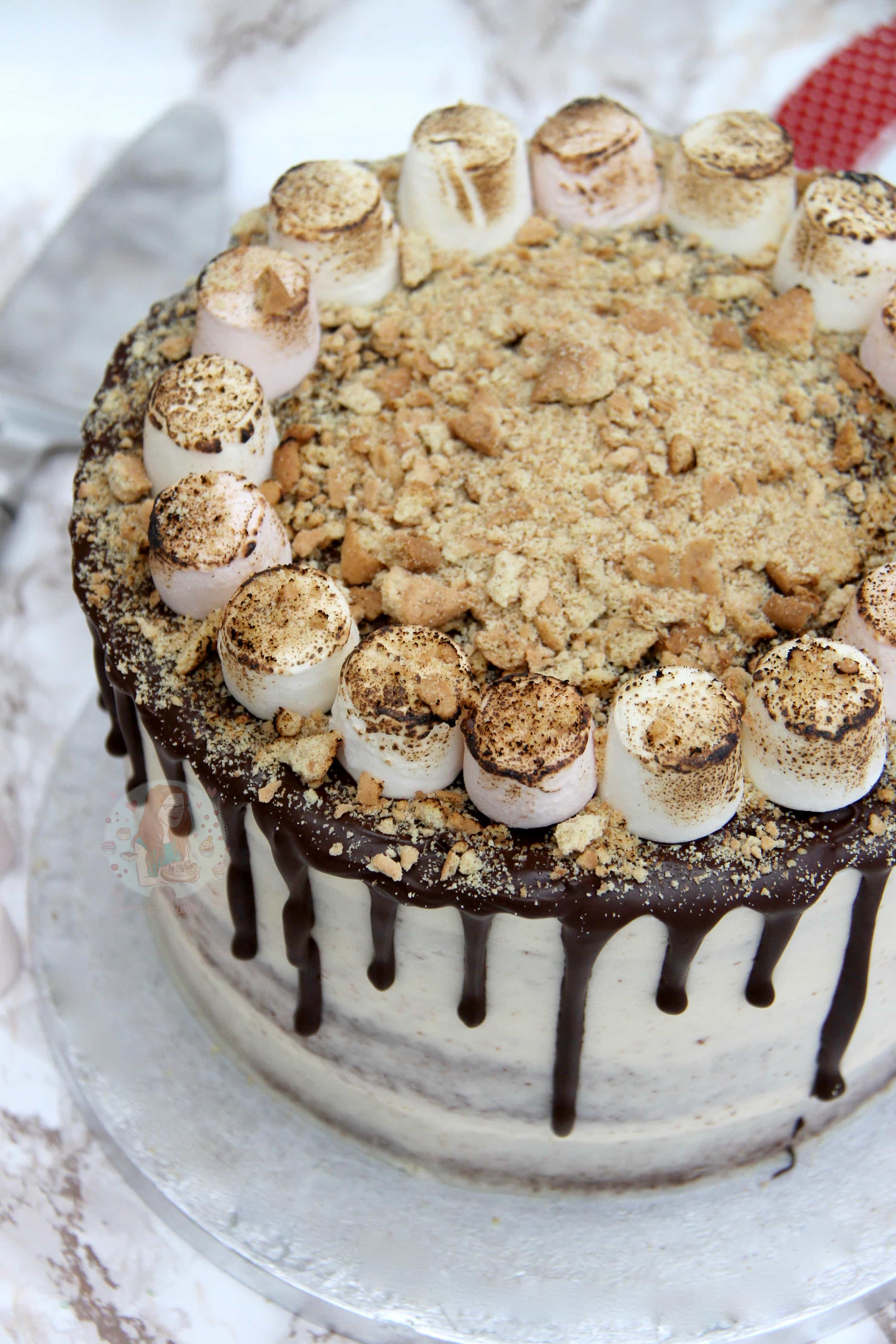 - Add some larger marshmallows around the edge of the top of the cake and toast them slightly with a blowtorch for a bonfire marshmallow effect. Crush over some biscuits and leave the chocolate to finish setting! Enjoy!