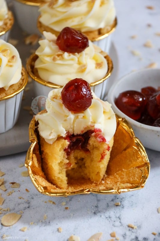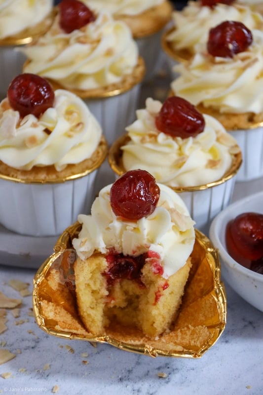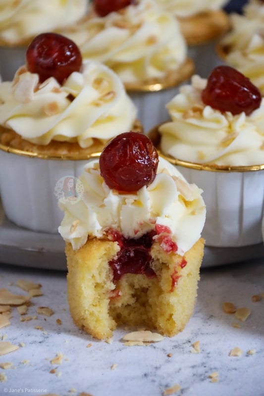 A cupcake twist on the classic… Cherry bakewell cupcakes with almond sponges, jam, almond buttercream frosting, and a glacé cherry of course!