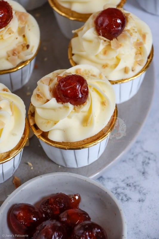 I used my favourite piping tip as always and swirled the frosting onto the baked, cooled and filled cupcakes – and decorated with some toasted flaked almonds, and a glacé cherry of course. You can toast the almonds really easily by adding them to a dry pan on medium heat, and moving them about until they golden nicely.