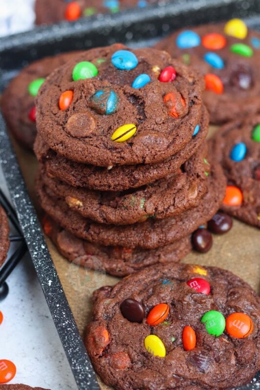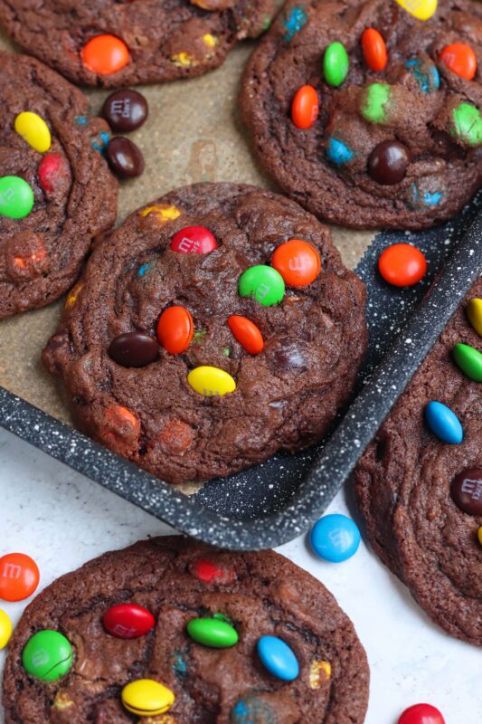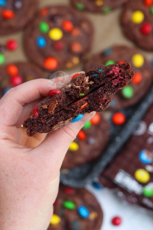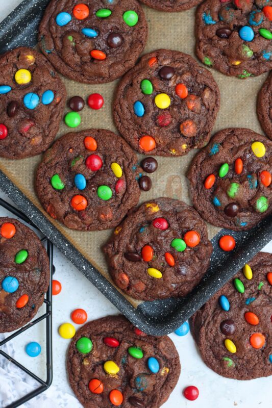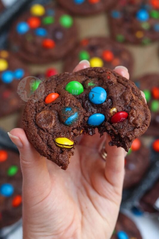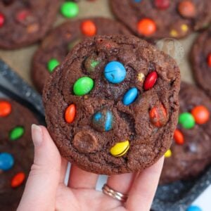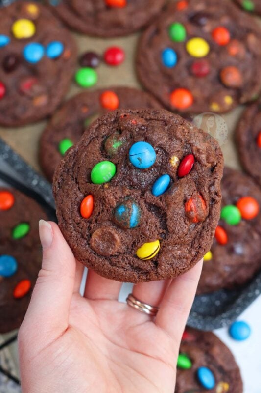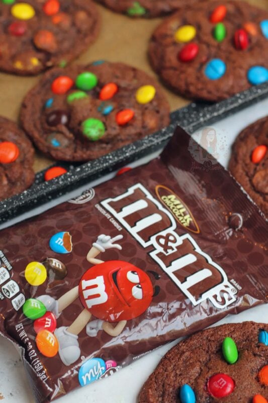 - Any type of M&M will work! I use normal Chocolate M&Ms as they’re my favourite, but your favourite flavour will also work fine! Sometimes the cookies might spread a little if using larger M&Ms like the peanut ones, but they should still be fine after the chilling!