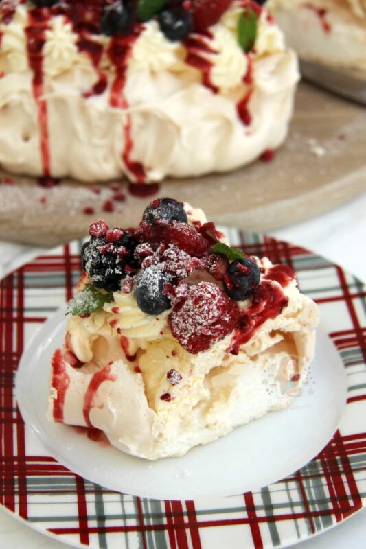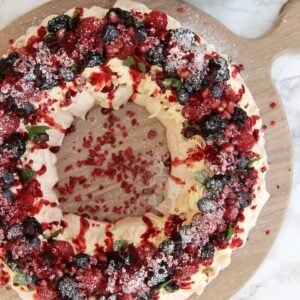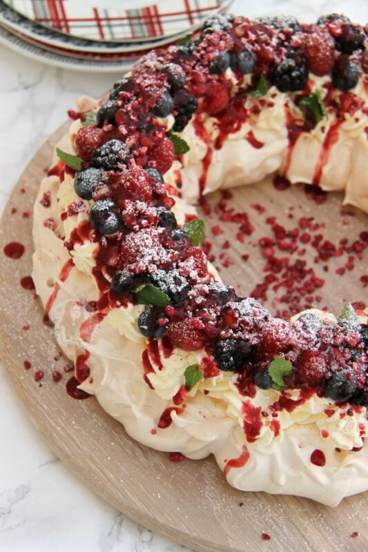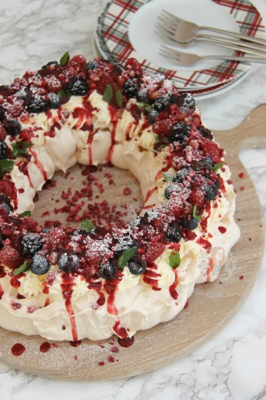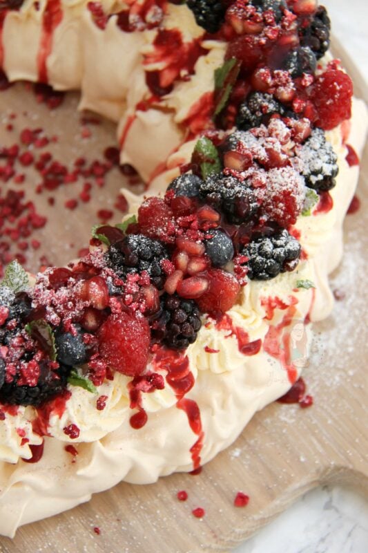 I think the white of the meringue and whipped cream teamed with the luscious red berries and green mint – you cant get a more festive colour combination. However, you can of course top your christmas pavlova wreath with whatever you prefer (like in my easter pavlova).