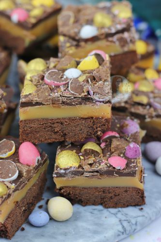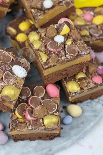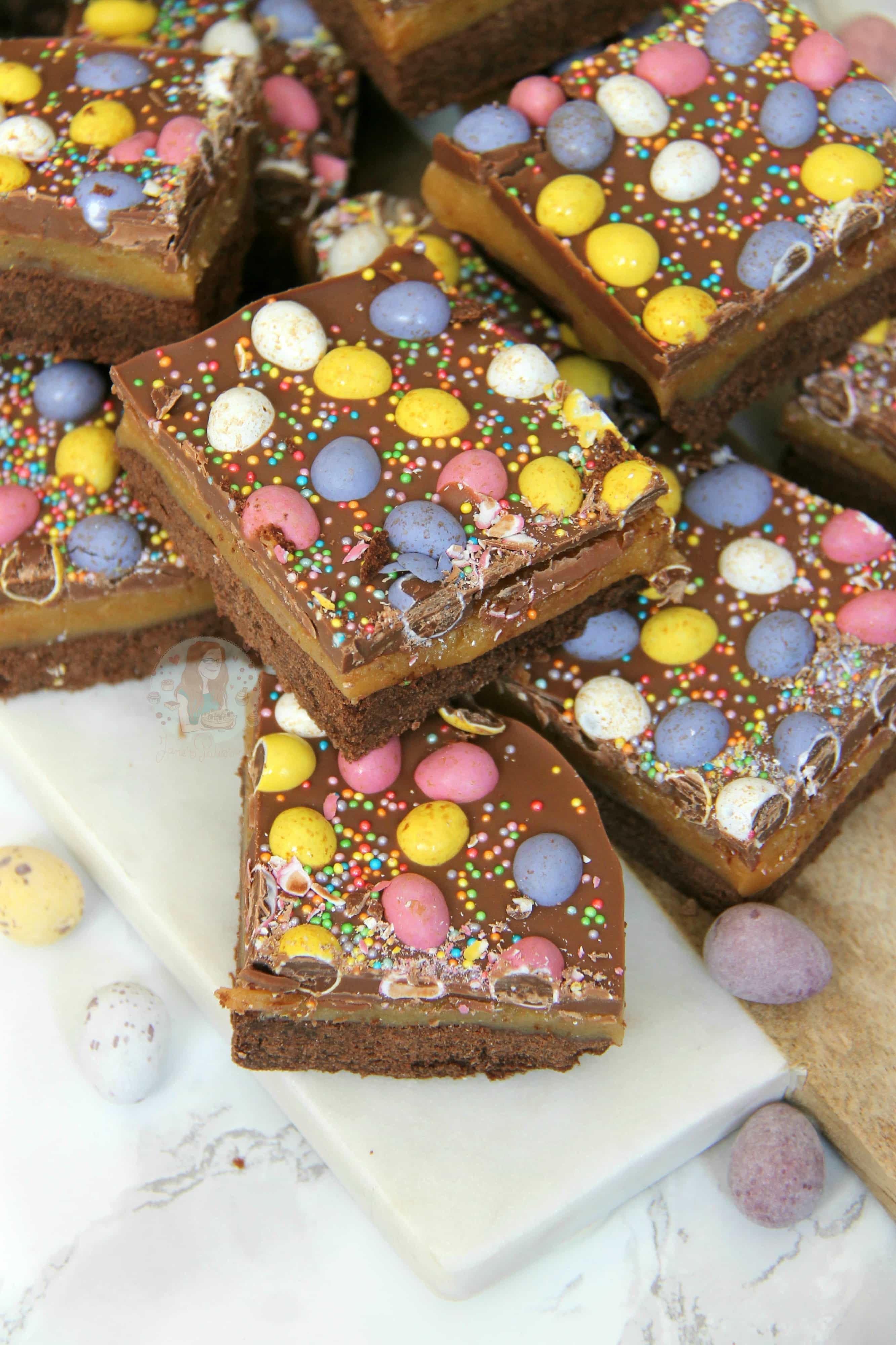 Honestly, I love it so much. My taste testers concurred! Having a crumbly chocolate shortbread, a sweet homemade and chewy/soft caramel on top, sweet milk chocolate and some easter treats is lovely. I hope you love this recipe as much as I do! Enjoy! x