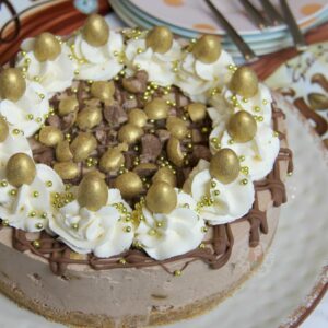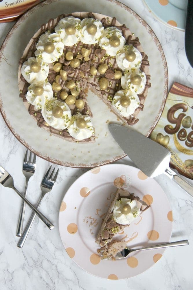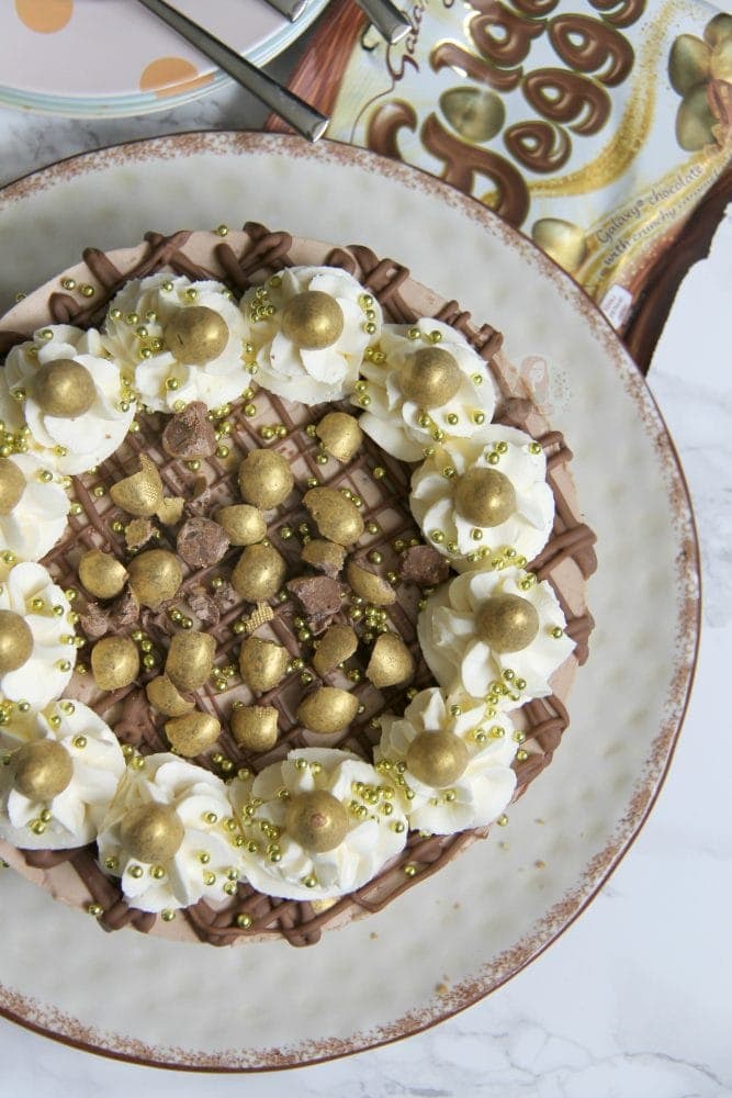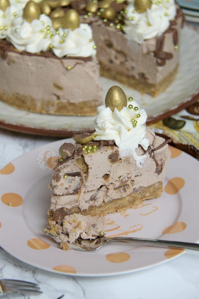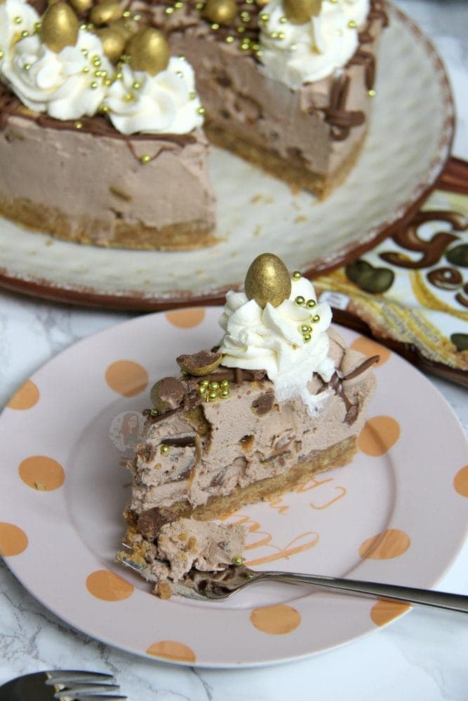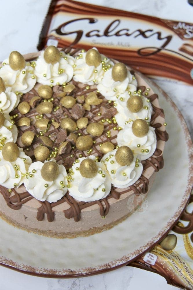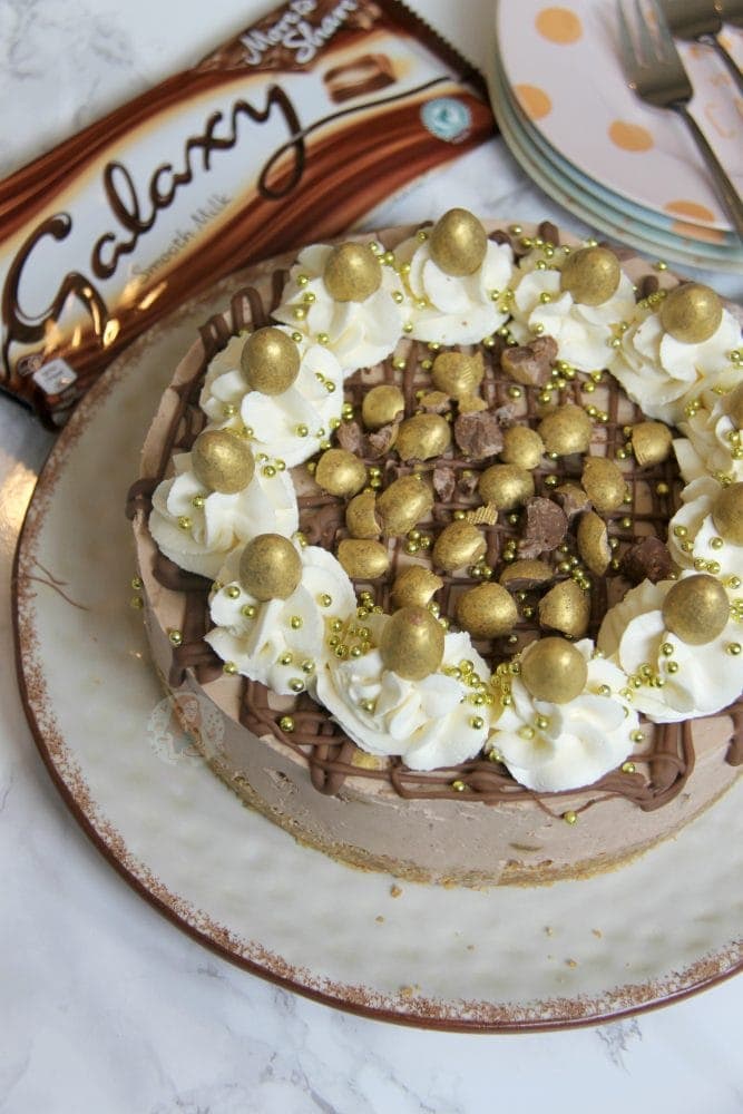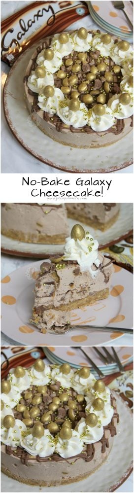 A Creamy, Chocolatey, Sweet, and delicious No-Bake Galaxy Cheesecake using Galaxy Golden Eggs. Perfect non-bake for Easter, or for any time of the year!