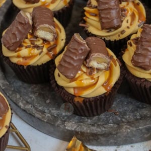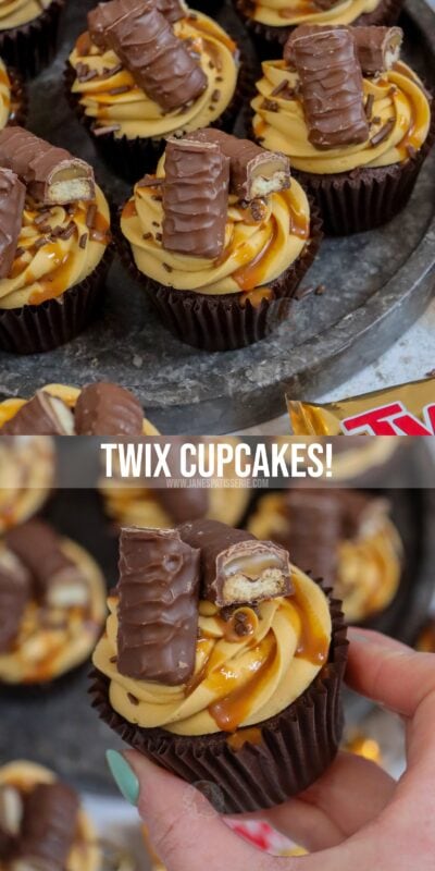 Delicious Twix cupcakes with chocolate sponge, hidden Twix pieces, caramel buttercream frosting, and even more Twix!