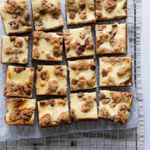 You can also flavour the cheesecake differently, if you like. You can use a bunch of different extracts such as lemon, orange, almond, or even coffee. I love making the cookie dough chocolate flavoured, and adding coffee to the cheesecake mix to make a mocha cheesecake cookie bars.