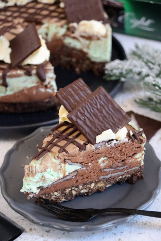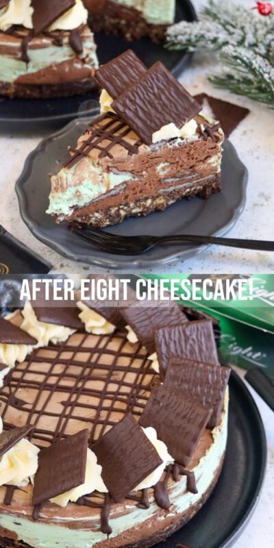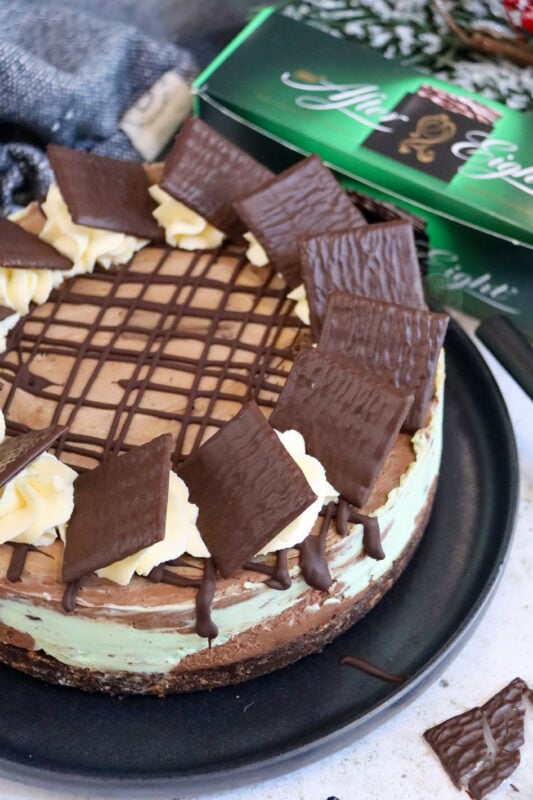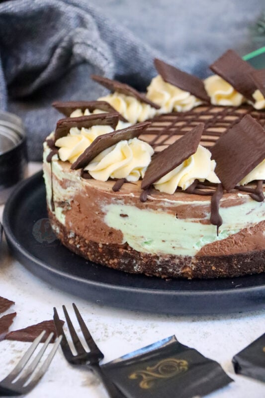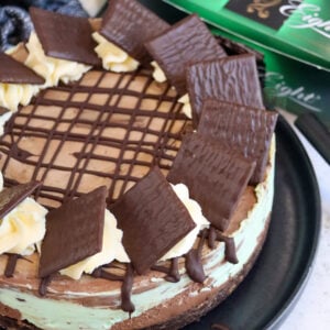 A dark chocolate and mint cheesecake full of After Eights. With a buttery biscuit base, and delicious decoration, my new favourite… no-bake After Eight cheesecake!