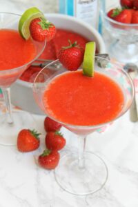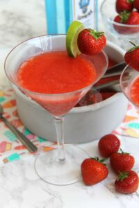 - Pour into your favourite cocktail glass, and garnish with some Lime and a Fresh Strawberry!