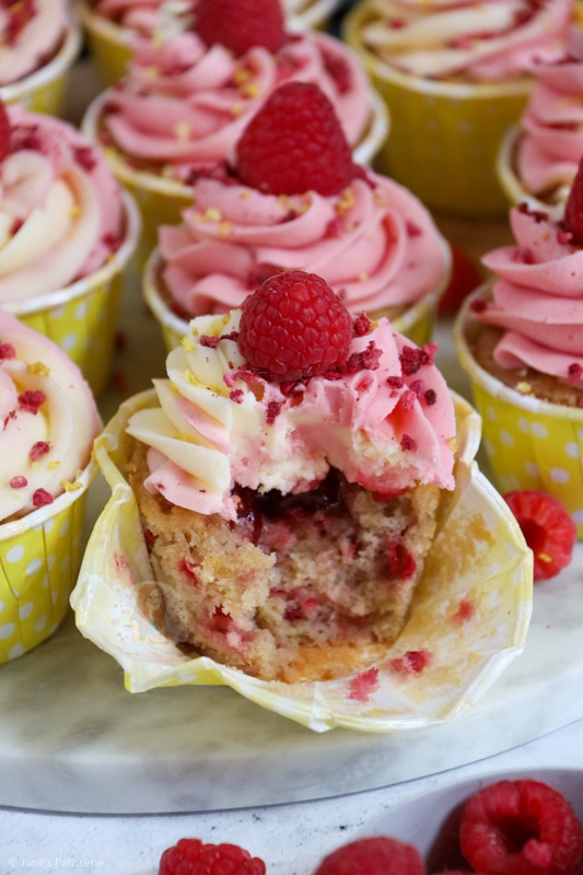 Lemon cupcakes with a raspberry jam centre, and swirled lemon and raspberry buttercream. My new favourite summery lemon and raspberry cupcakes!