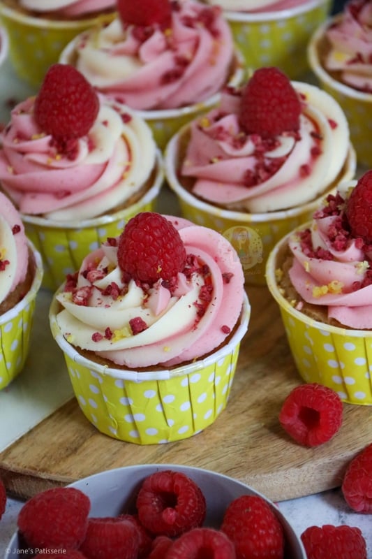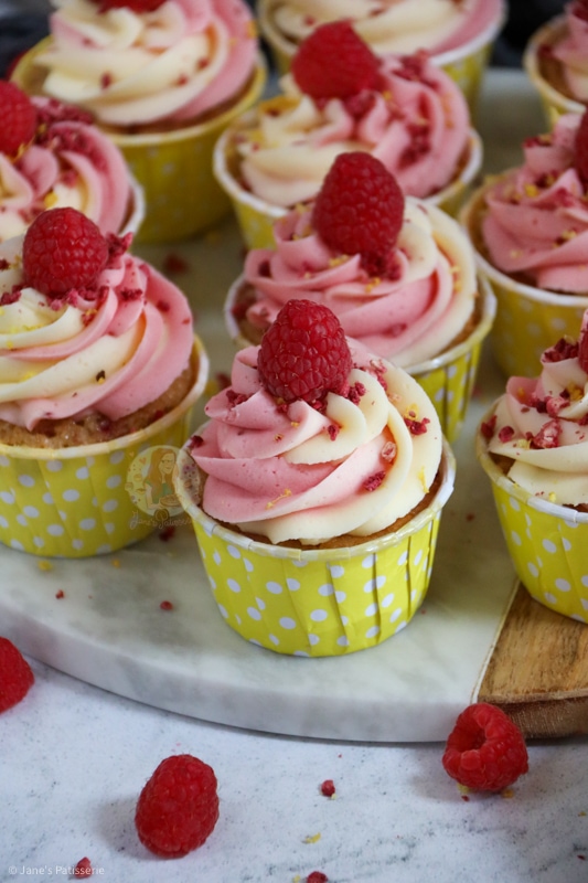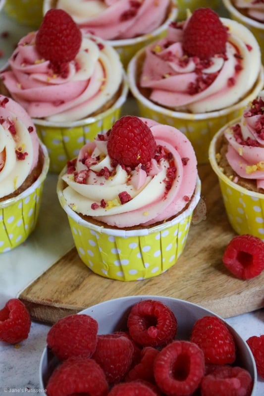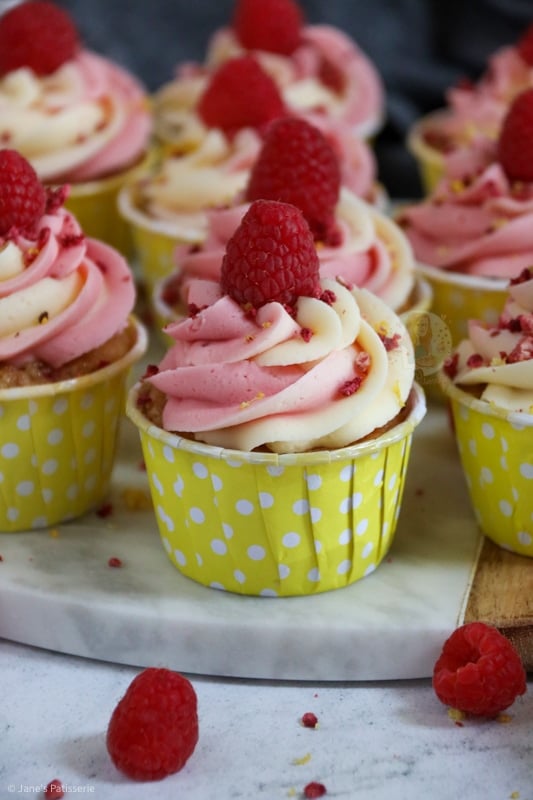 I piped the buttercream onto the cupcakes, sprinkled on some freeze dried raspberries, lemon zest and added a fresh raspberry and they were done! I do think they’re super pretty cupcakes, as well as being utterly scrumptious.