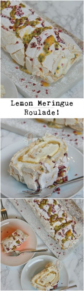 A Crunchy, Chewy, Soft Lemon Meringue filled with Freshly Whipped Cream, Lemon Curd, Passion Fruit, and some Freeze Dried Raspberries to decorate. A Delicious Lemon Meringue Roulade!