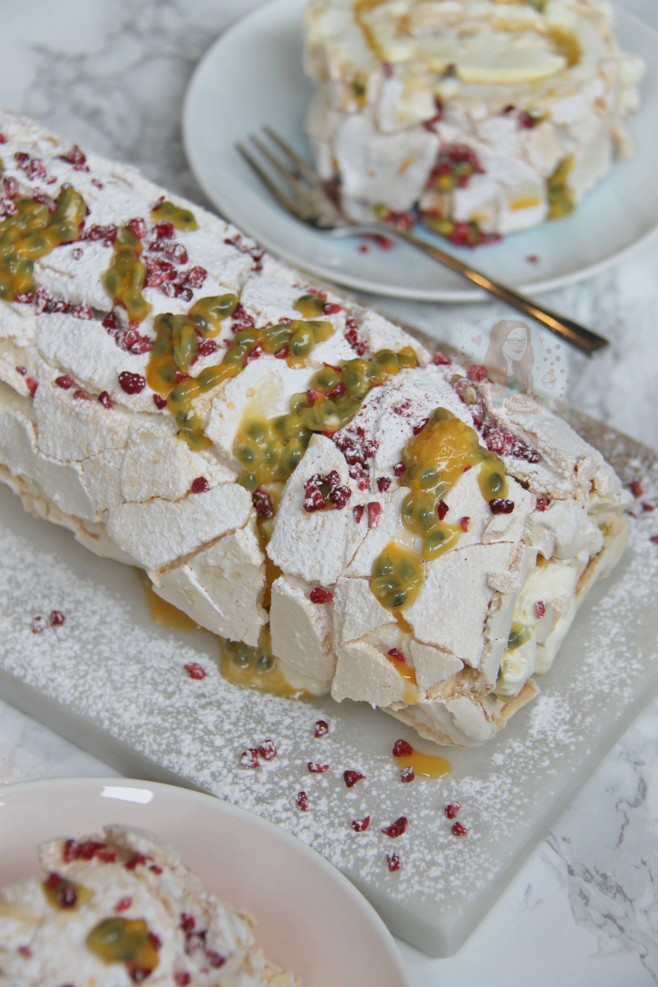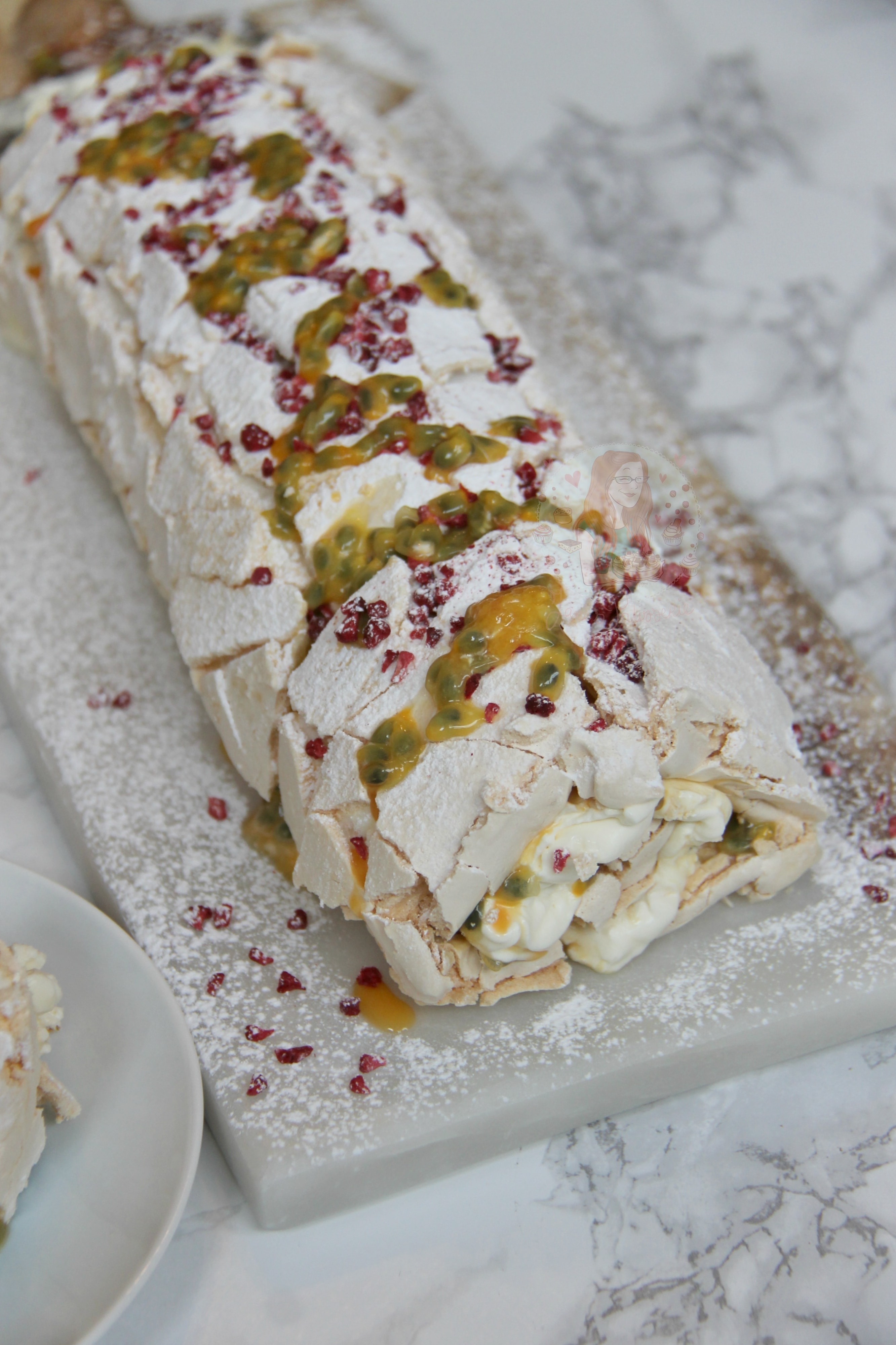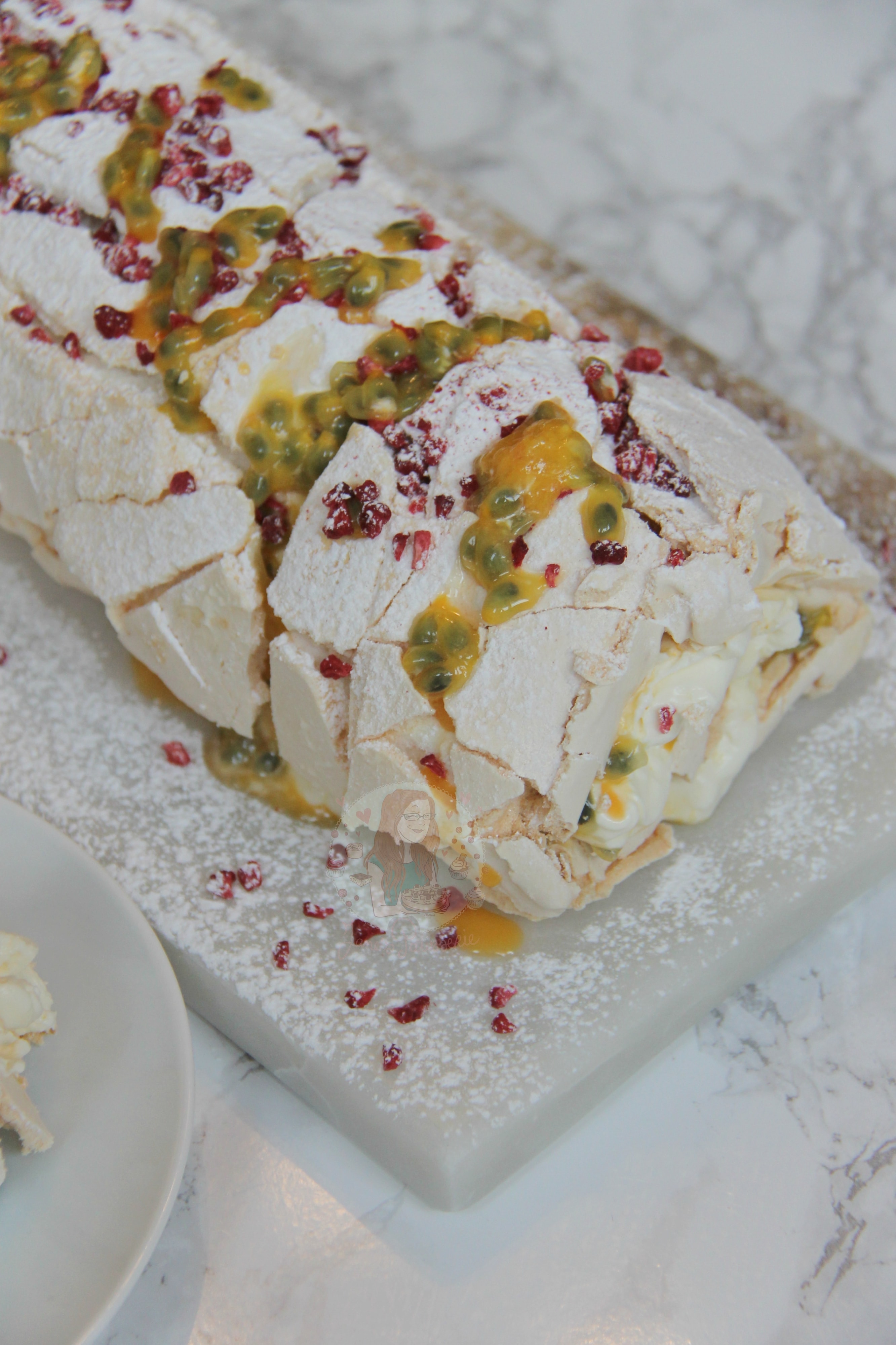 - From one long side, to the other, roll the meringue carefully so it forms the roulade. The meringue will naturally crack slightly, as its meringue. Sprinkle on some spare icing sugar, and sprinkle over some Freeze Dried Raspberries, and any spare passion fruit. Enjoy!