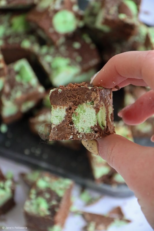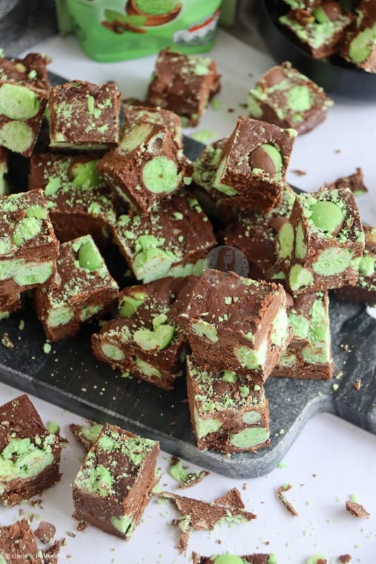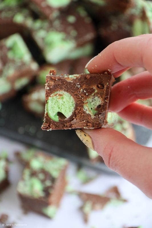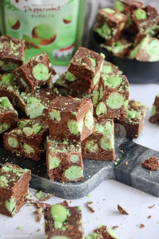 - Sprinkle on some Mint Aero crumbs, and some whole bubbles/pieces and press into the top of the fudge and store in the fridge for at least 5-6 hours (Or preferably overnight) to set!