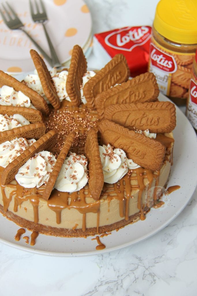 A delicious no-bake Biscoff cheesecake, with a Lotus base, sprinkled with more biscuits and whipped cream and a Biscoff drizzle.