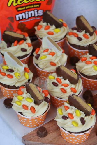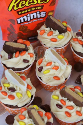 - Using a medium 2D closed star piping tip, pipe the buttercream onto the cupcakes – add on half a peanut butter cup, and some Reese's Pieces, and enjoy!