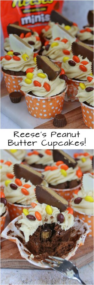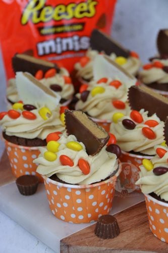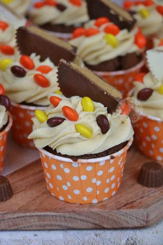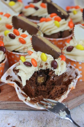 Chocolate cupcakes with a hidden Reese’s peanut butter cup centre, peanut butter frosting, and even more Reese’s = heavenly peanut butter cupcakes!
