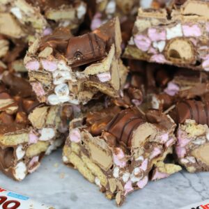 You think I could make a kinder rocky road using white hazelnut spread and follow the biscoff rocky road quantities and swap biscoff spread for hazlenut. Then half the digestives and add kinder buenos 🙂