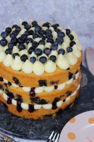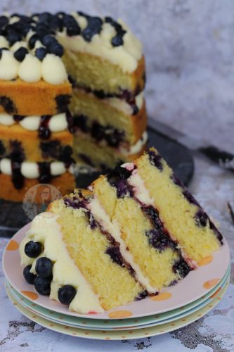 I didn’t think blueberries would be any good at this time of year yet, but oh my they have been seriously delicious. So, this cake happened. I was wondering how I could make something fruity, and light, but so moreish and a bit of a showstopper… so I wanted something that would dazzle. The fresh blueberries in the sponges give the cake a whole new element.