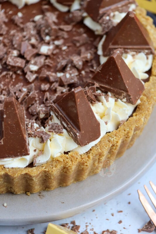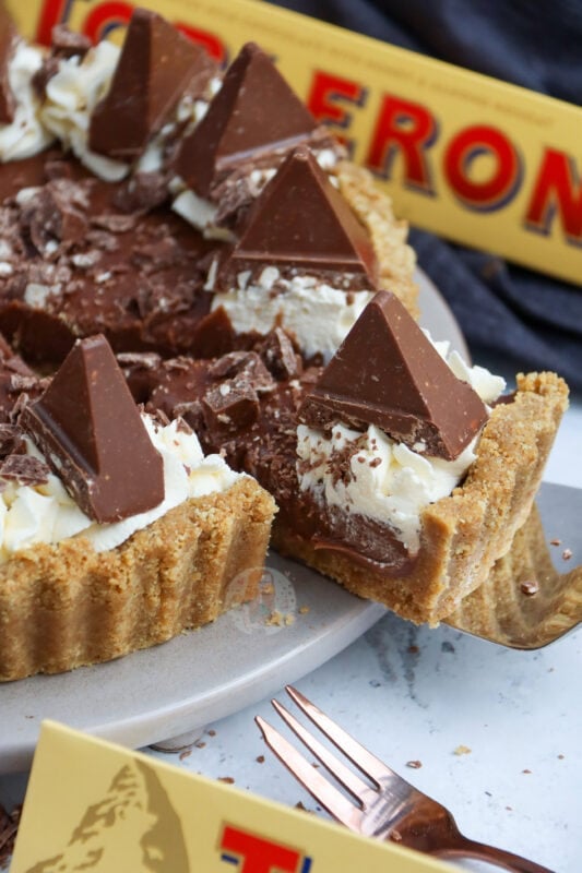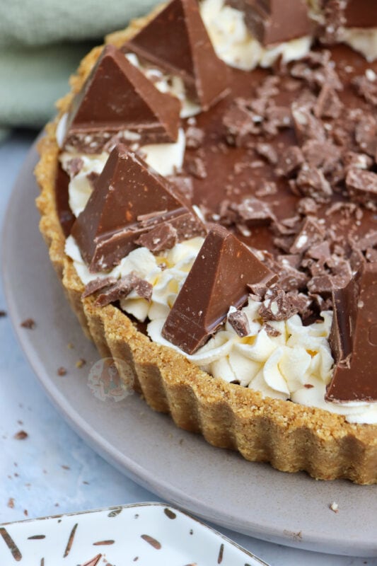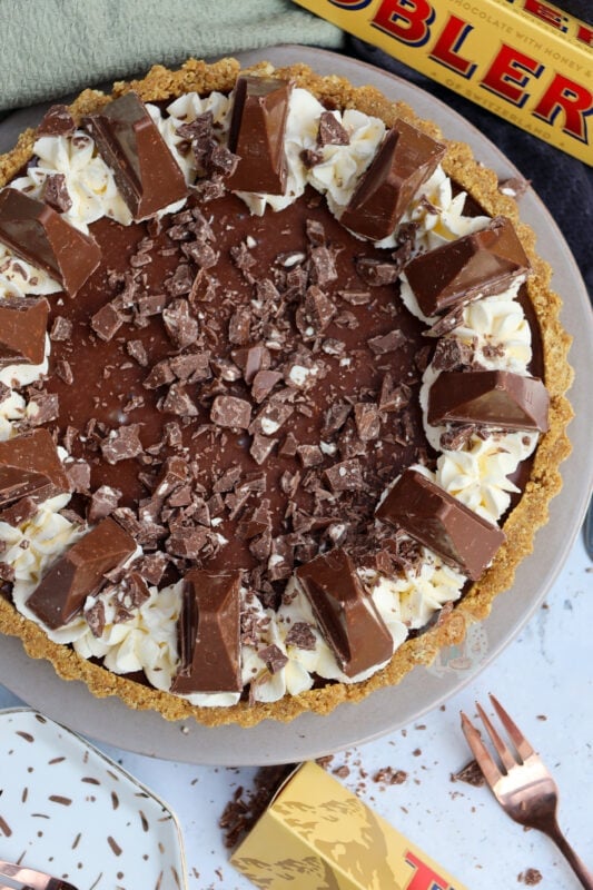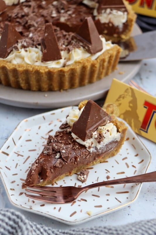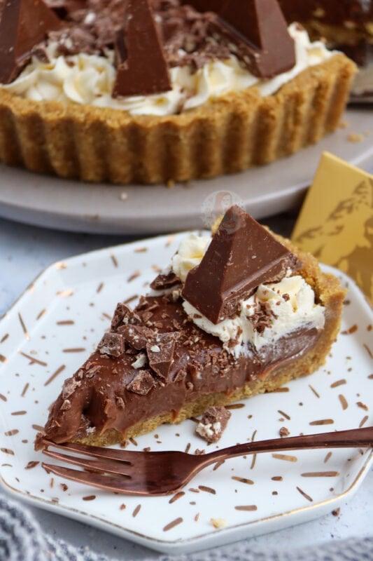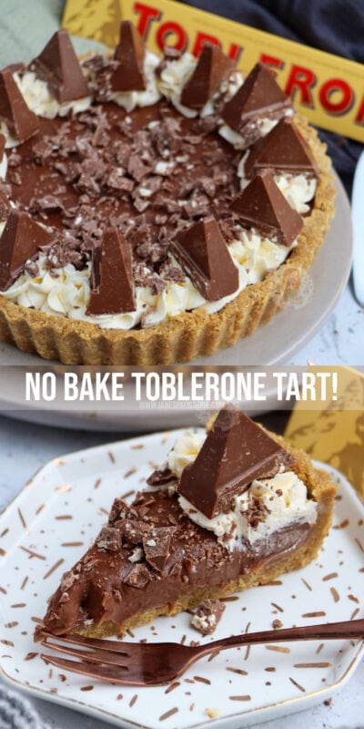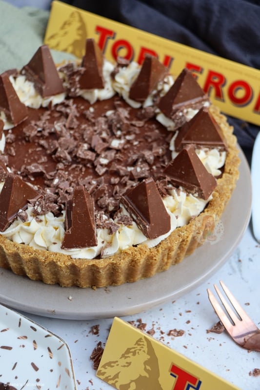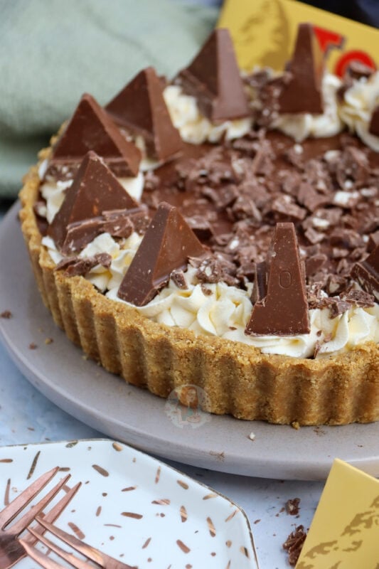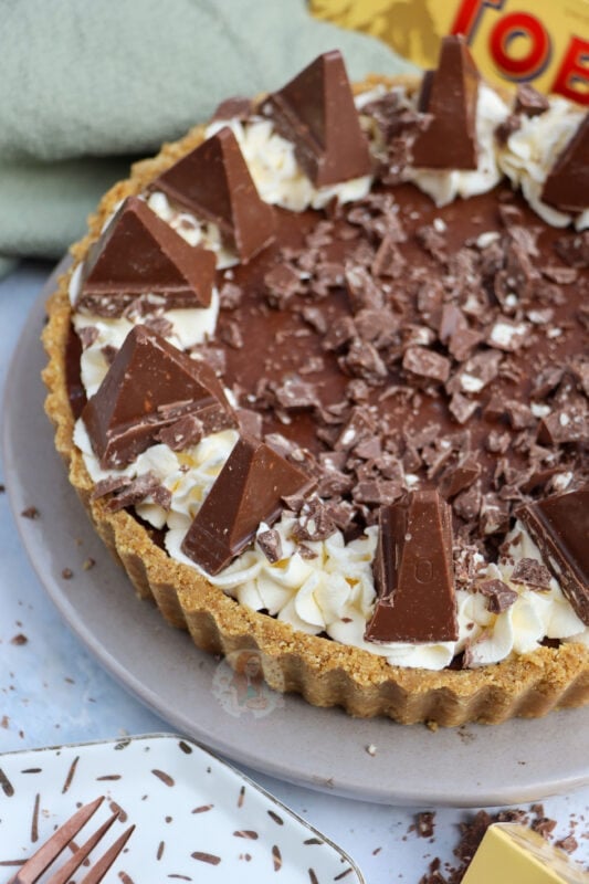 An easy, delicious, show stopping no-bake Toblerone tart with a biscuit crust, a Toblerone filling and more!
