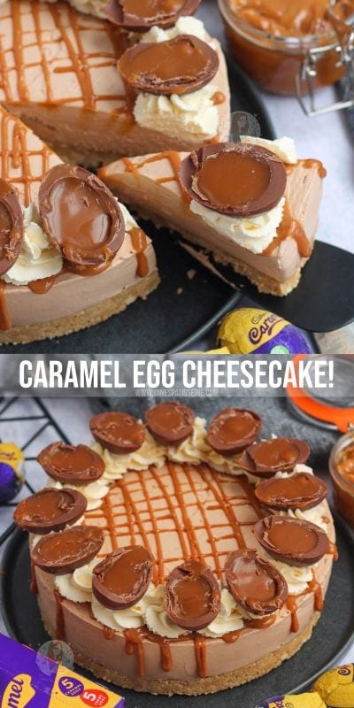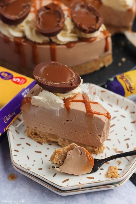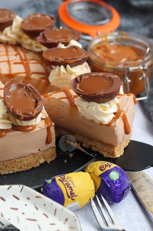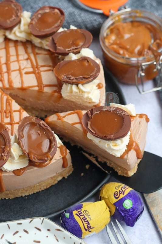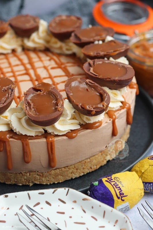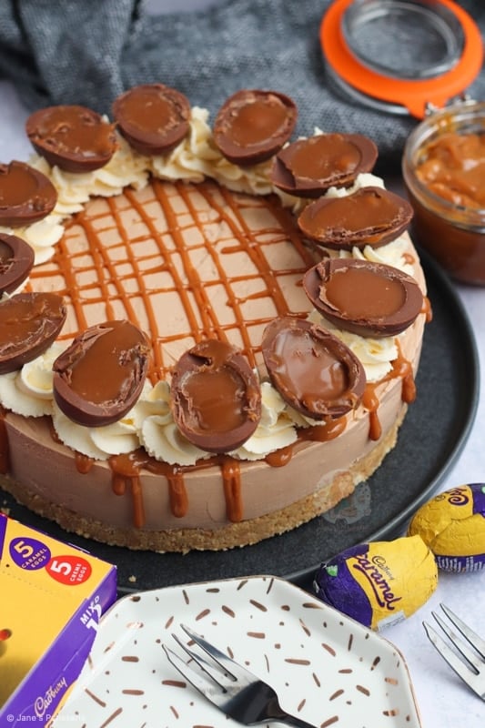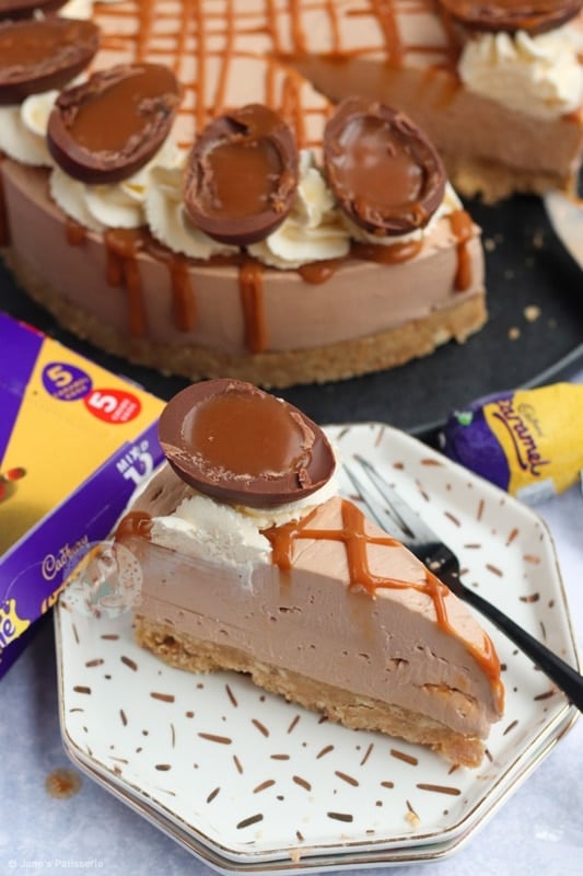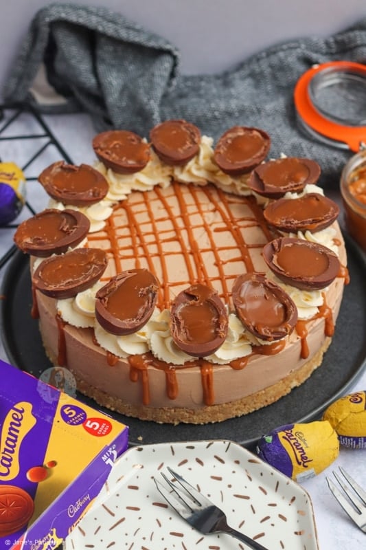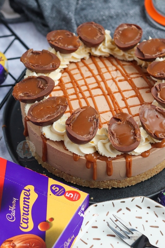A no-bake Cadbury’s caramel cheesecake with a biscuit base, chocolate caramel cheesecake filling, delicious decoration and more!