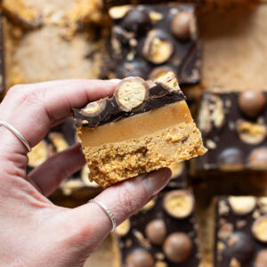 So… millionaires shortbread is one of my most favourite things on the planet. I adore it. I have several recipes on here now that always come up trumps when I post them such as my Terry’s chocolate orange millionaires shortbread and my salted caramel millionaires shortbread, but this time I wanted something that felt extra nostalgic and indulgent. When so many of you started asking for a Malteser-packed version, I knew it was a sign to finally bring this idea to life.