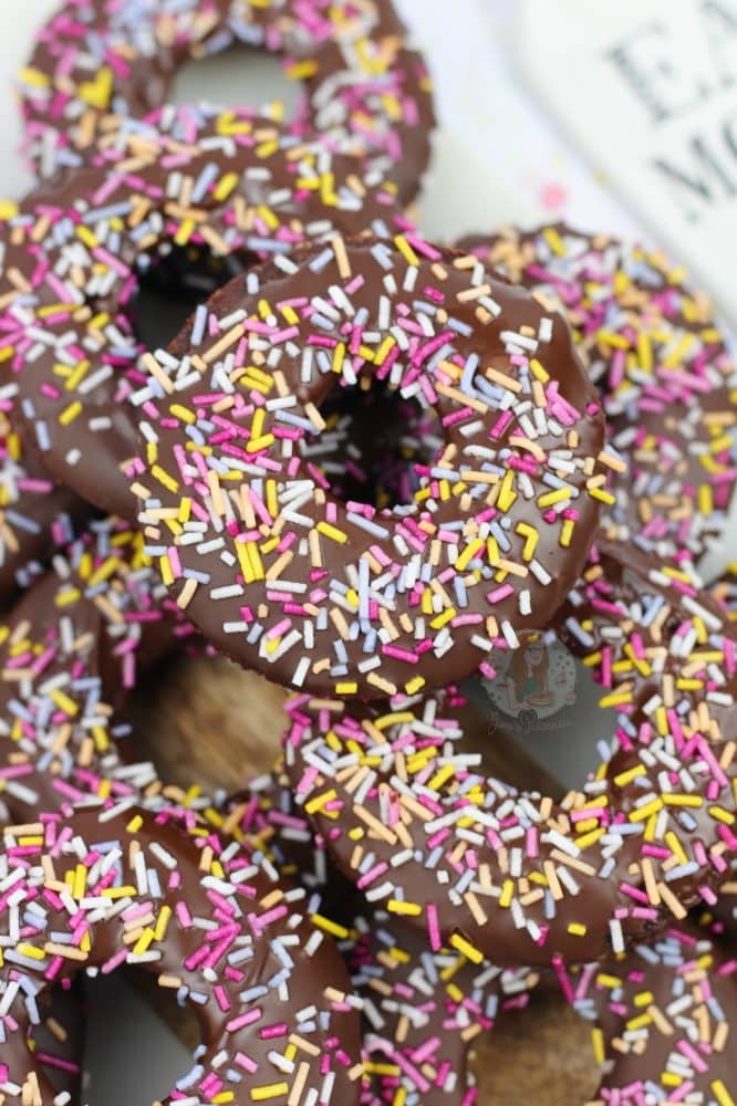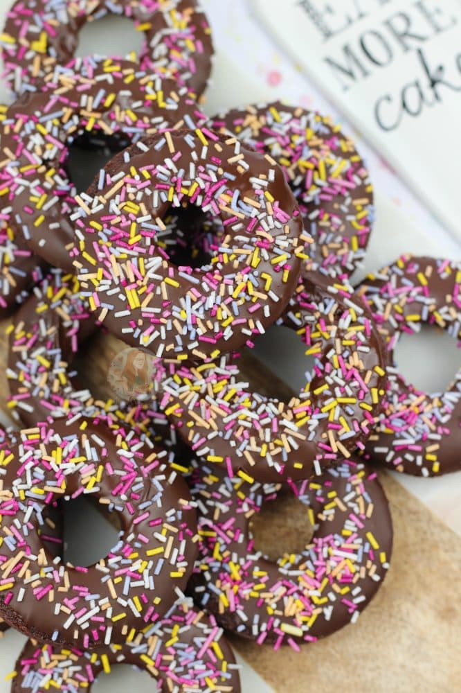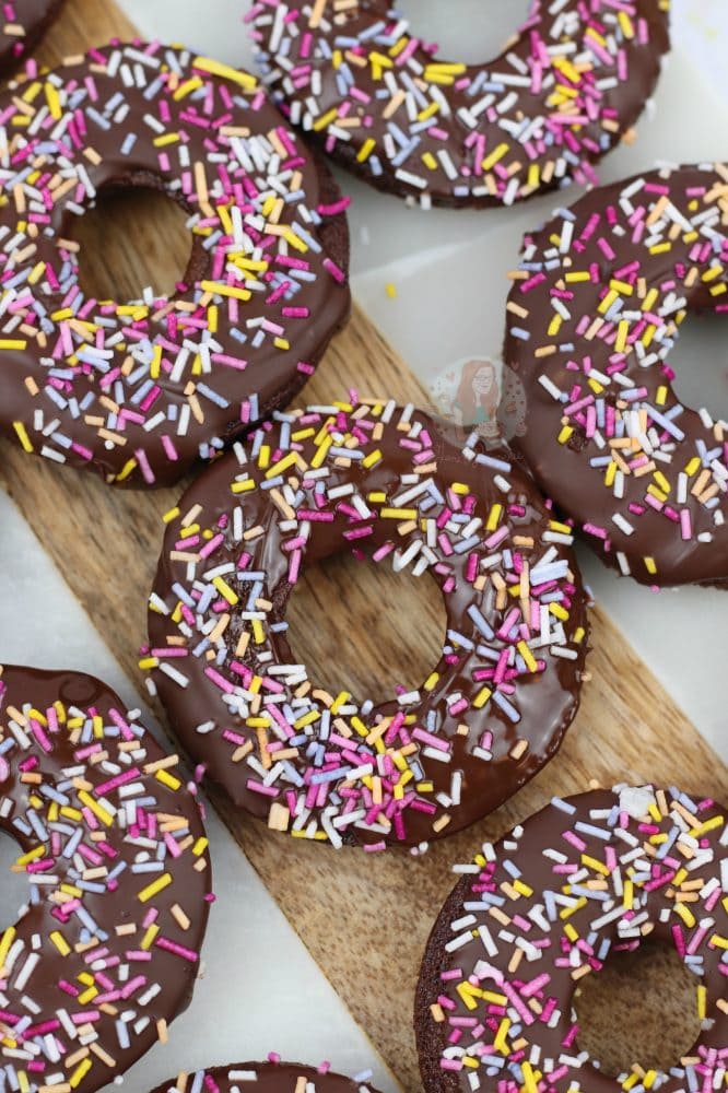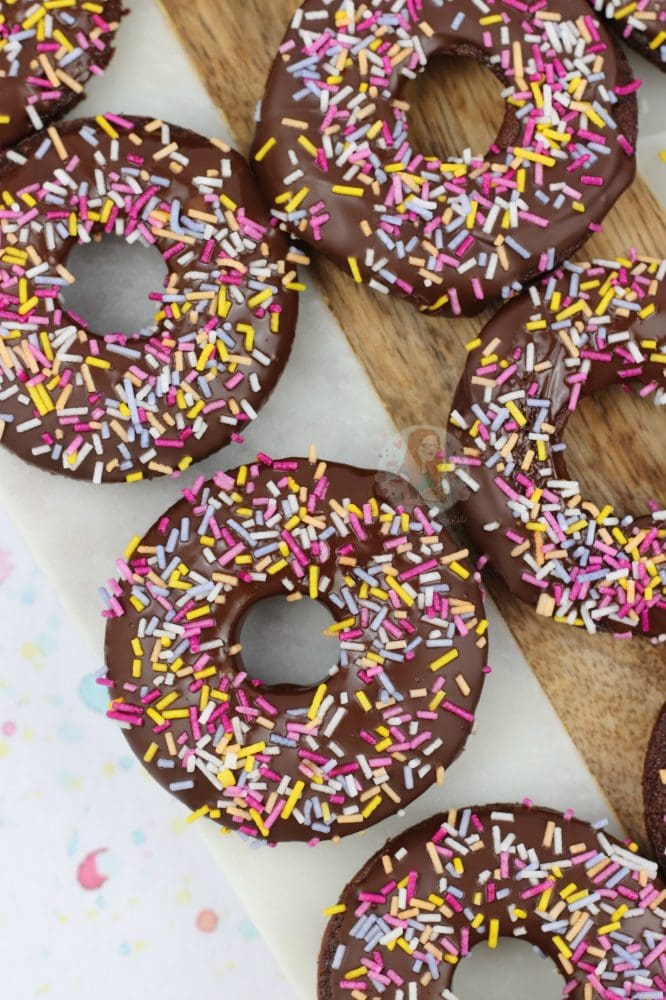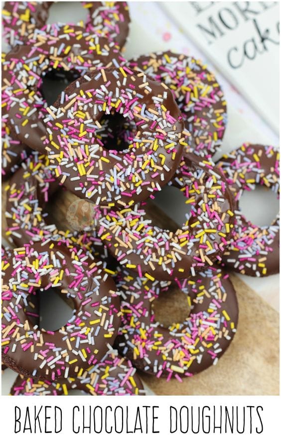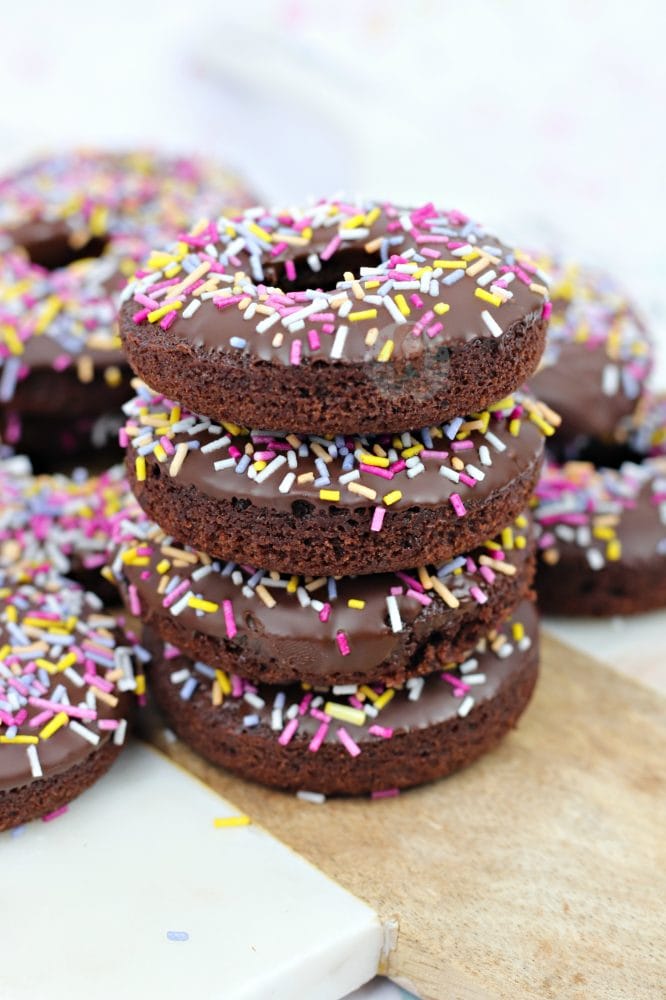 Easy baked chocolate doughnuts with a chocolate topping and sprinkles.