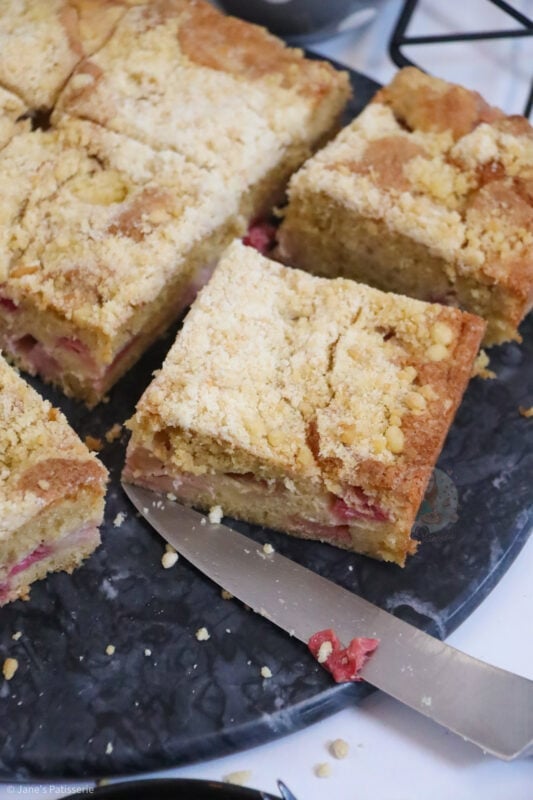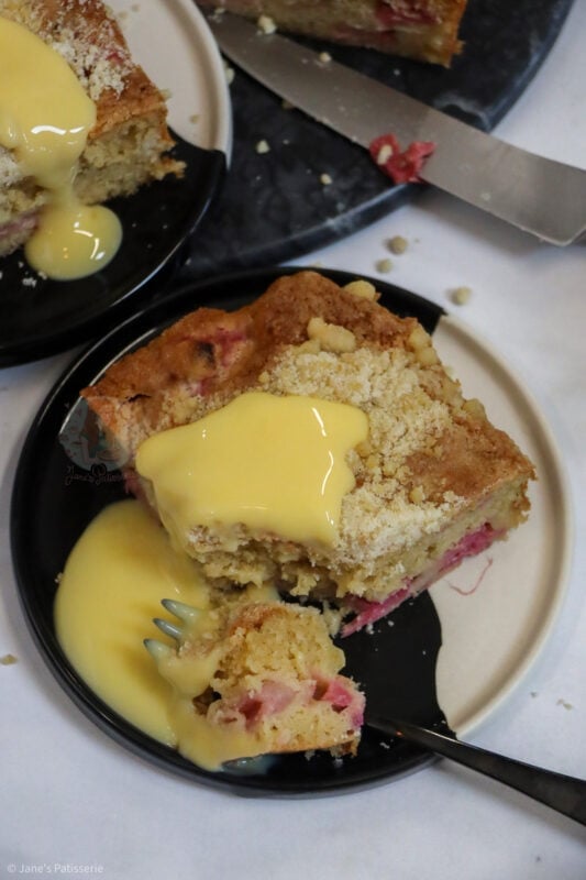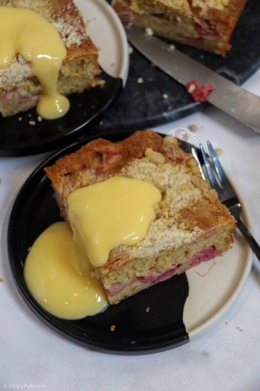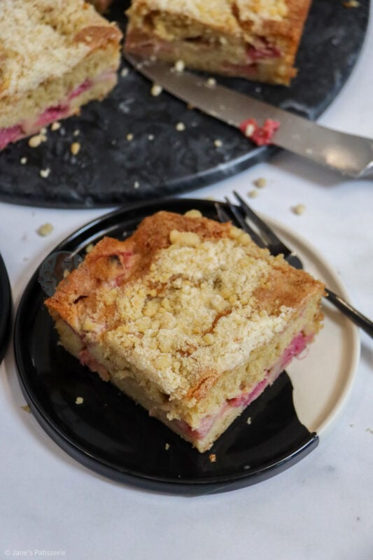 The cake is basically just a regular sponge cake, with rhubarb added in, and crumble mixture on top. It therefore takes a little longer to bake, but thats totally okay. The added moisture from the rhubarb keeps the cake soft as well and prevents it getting dry. The crumble part is completely optional, but its just so damn good.