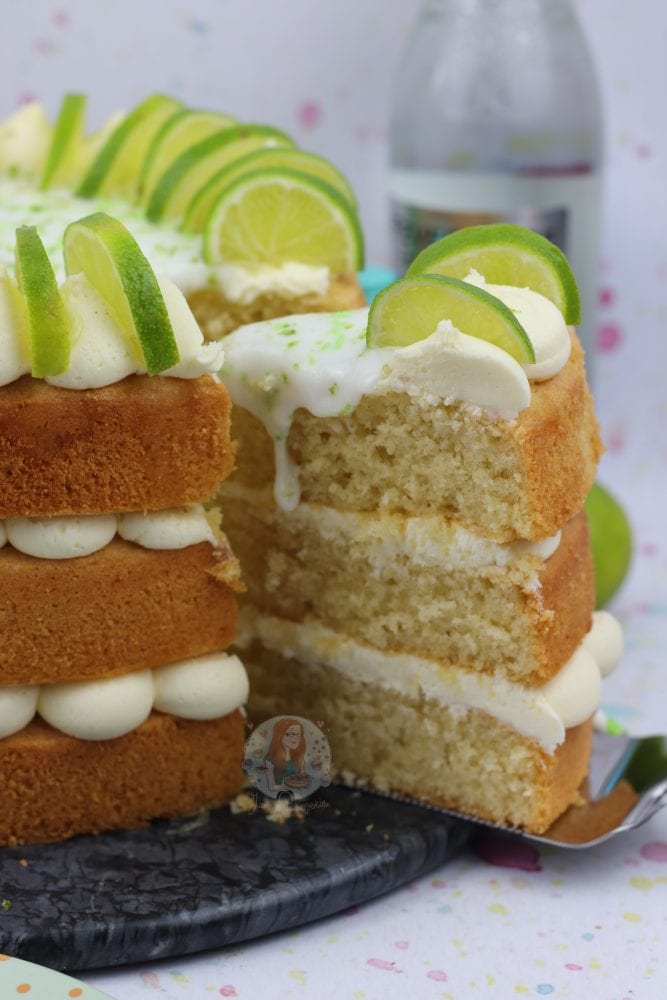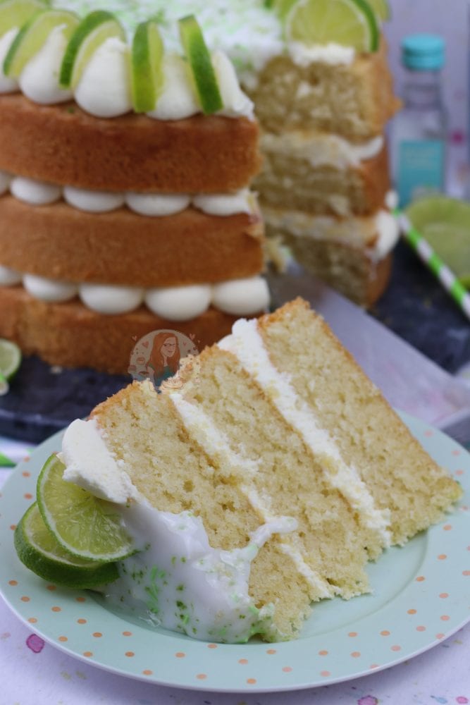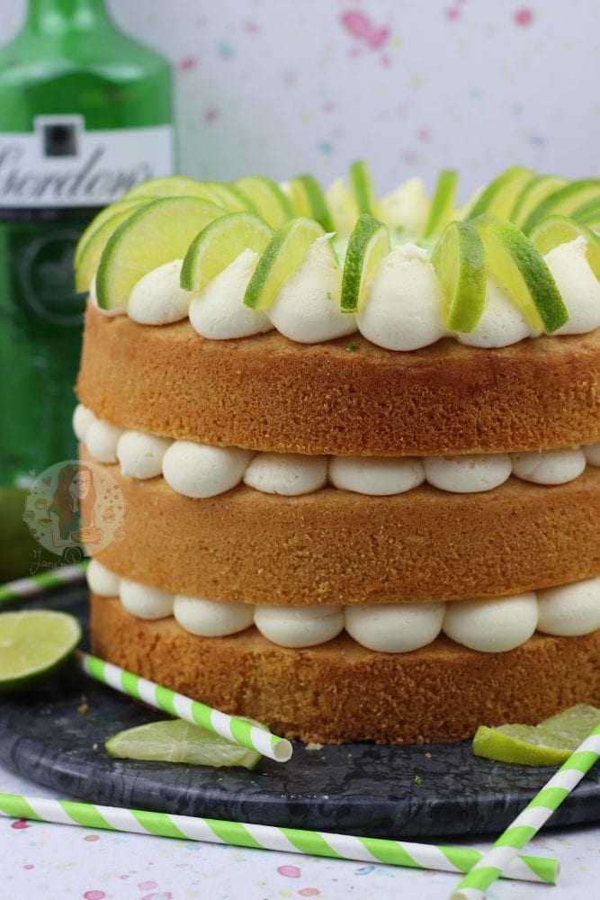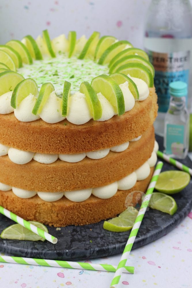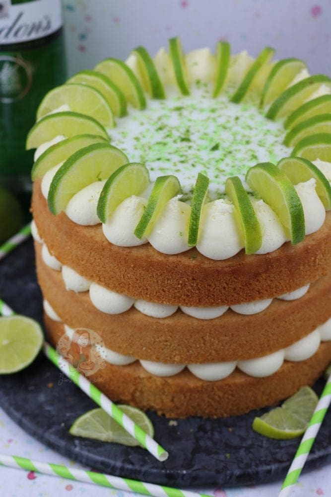 A three layer gin and tonic cake with G&T drizzle, and G&T frosting with a touch of lime.