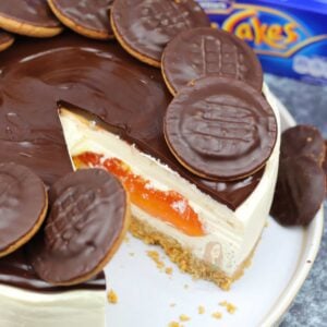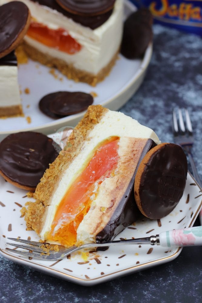 - Spread it over the top of the cheesecake, and add some Jaffa cakes for decoration. I do one per slice!