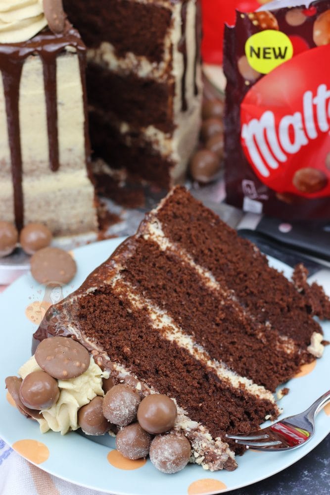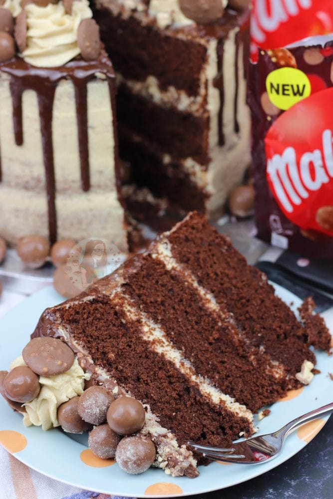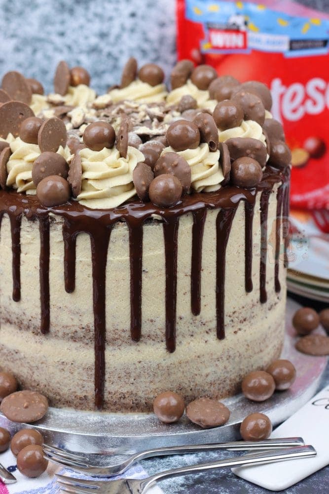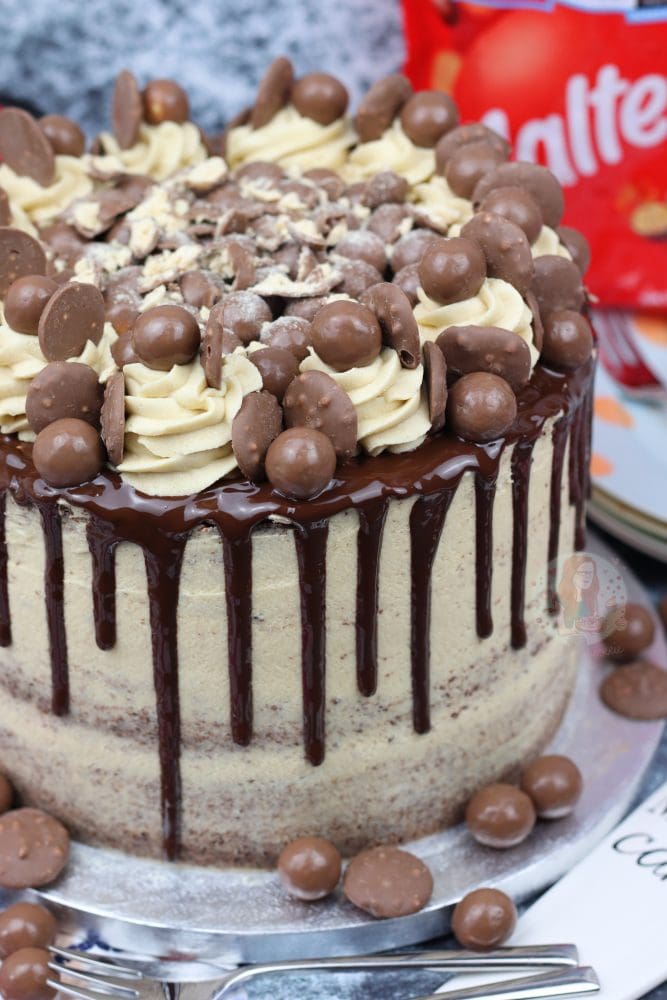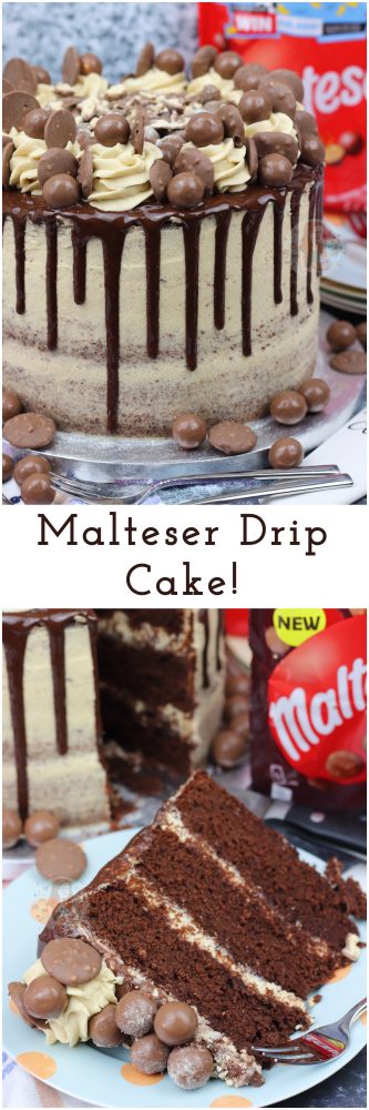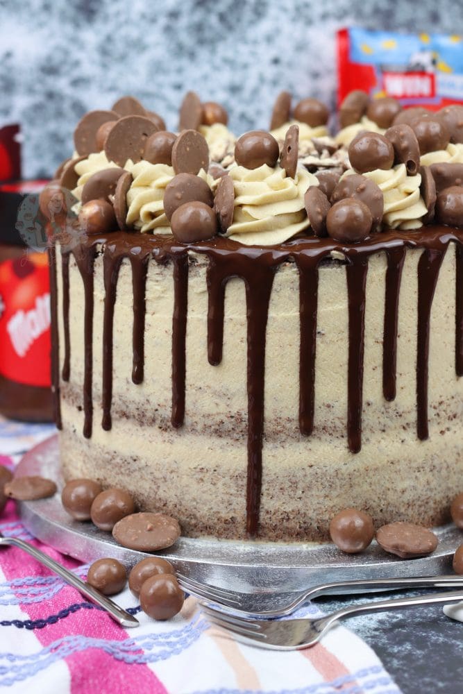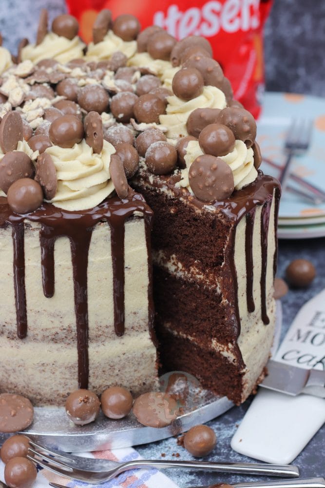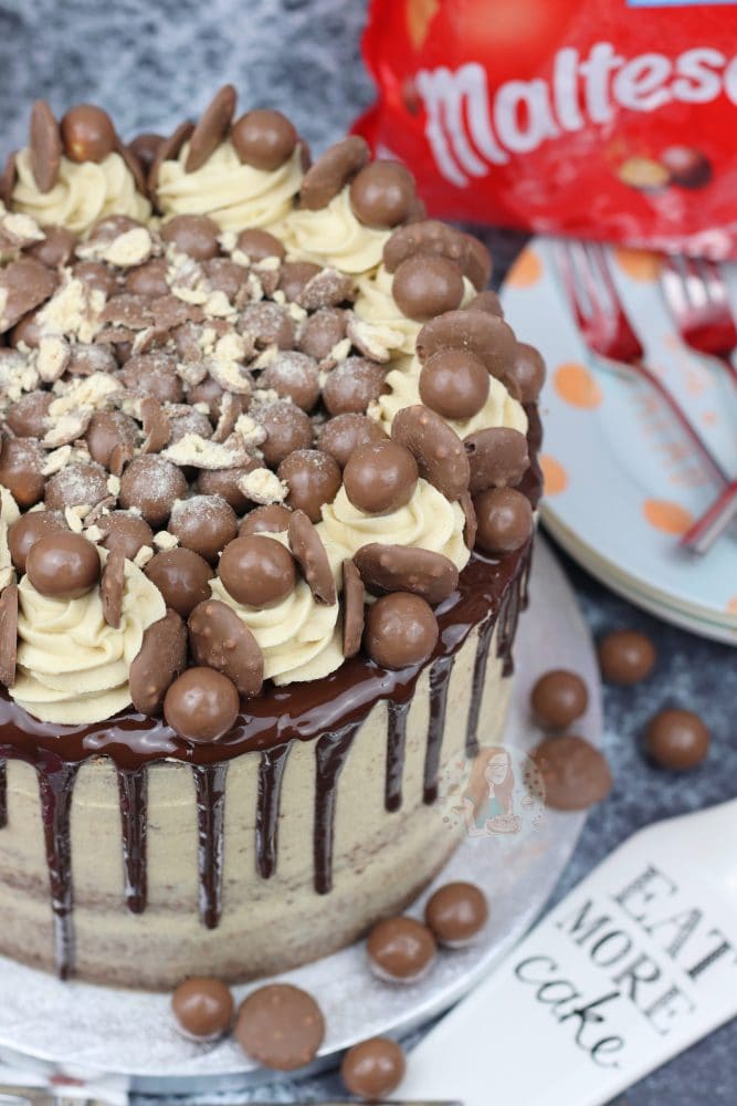 A three layer malt chocolate cake with malt buttercream frosting, Malteser spread, and a chocolate drip with oodles of Maltesers! Delicious Malteser drip cake!