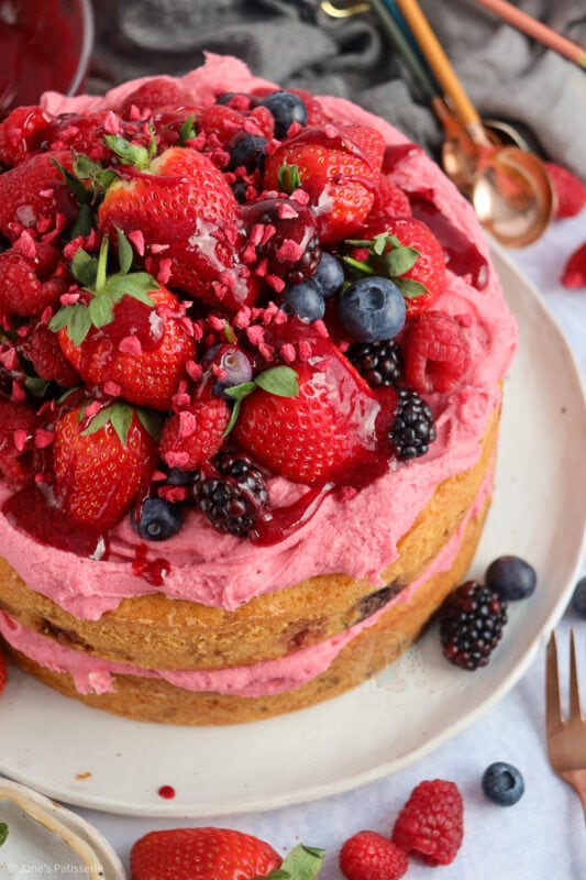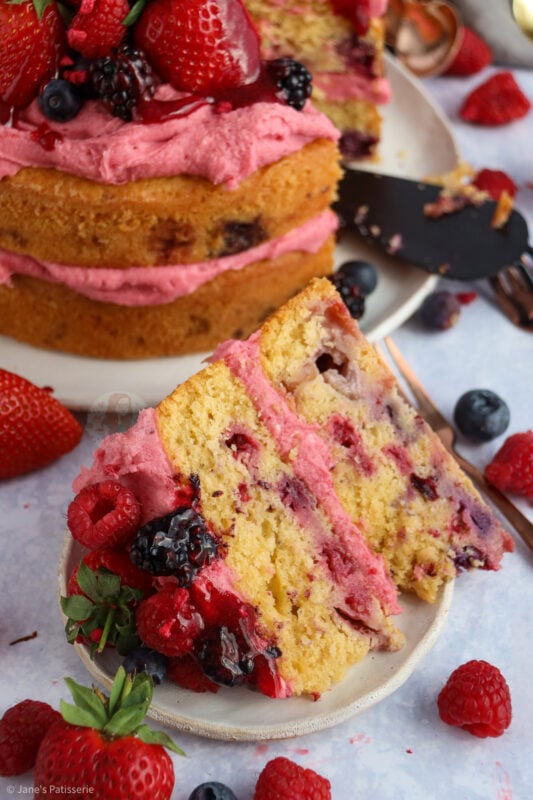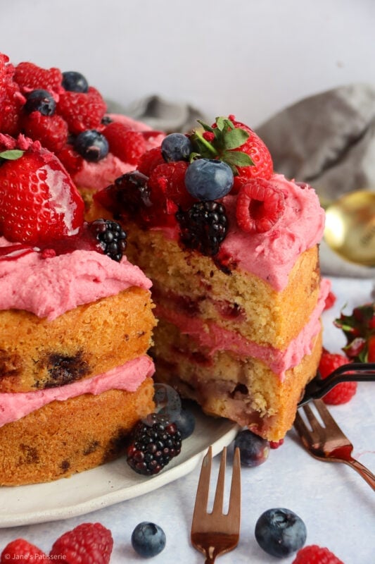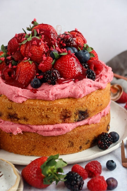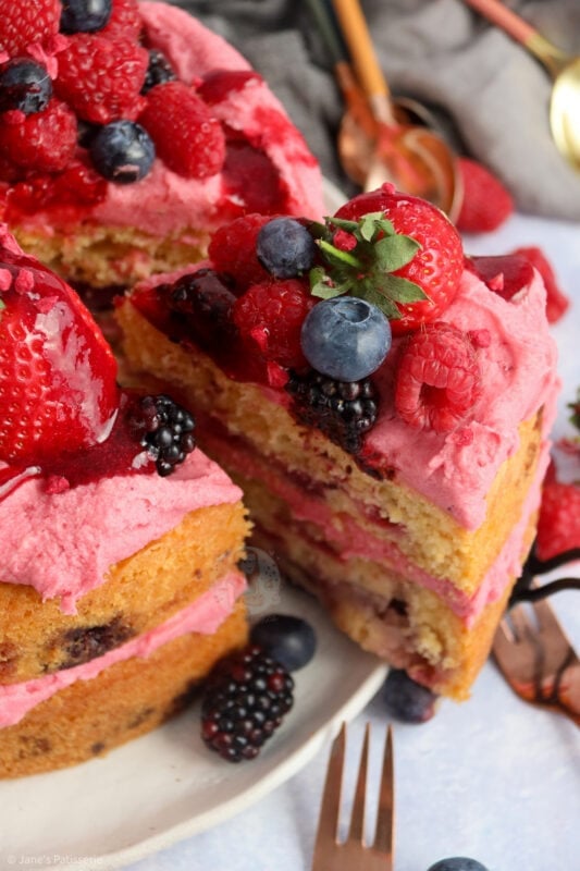 It’s the fruitiest cake whilst also being so incredibly fresh. Using your favourite summer berries in the cake means you get the flavour you want!
