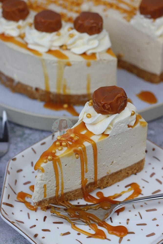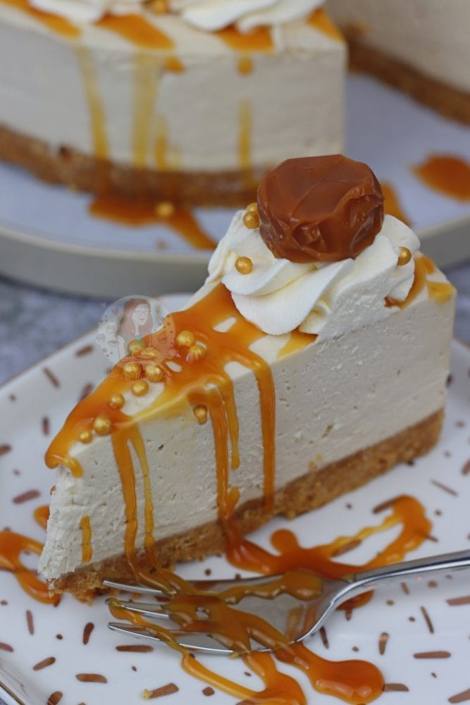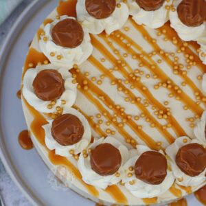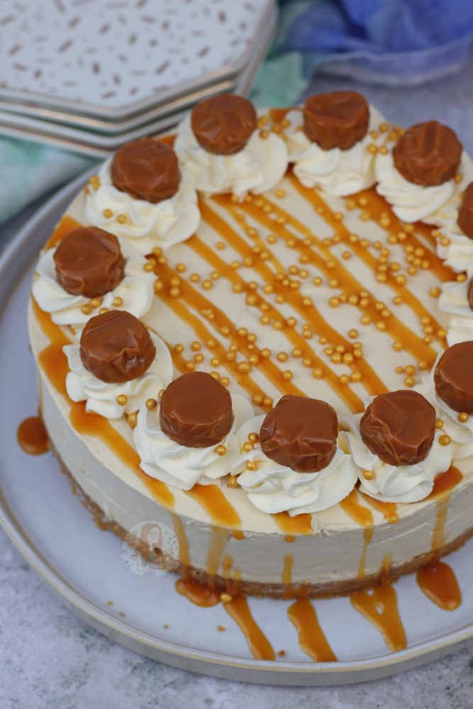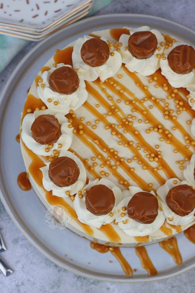 I decided to decorate this butterscotch cheesecake with an extra drizzle of the butterscotch sauce because why not?! But also some cute little sprinkles, and a toffee on each cream swirl. This is all optional, but I like my cheesecakes to look pretty in their pictures so I always go all out! Enjoy! x