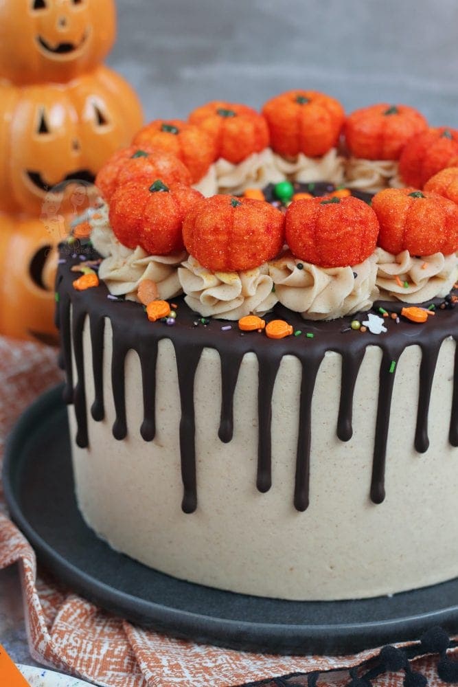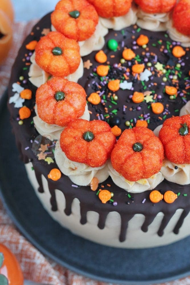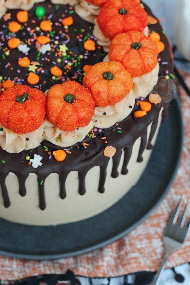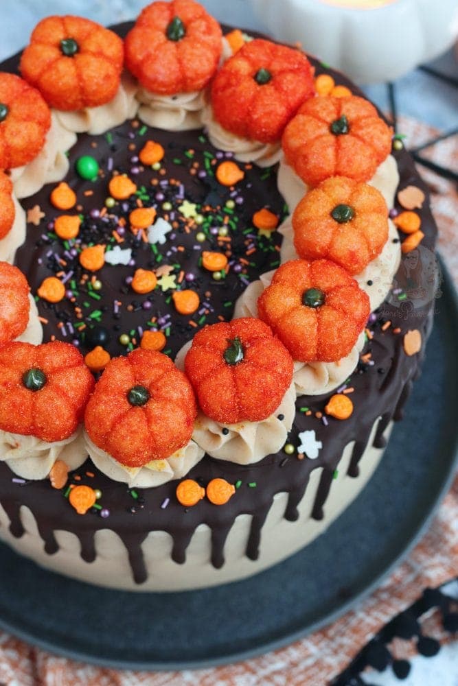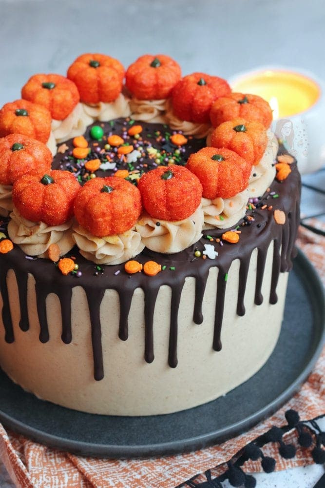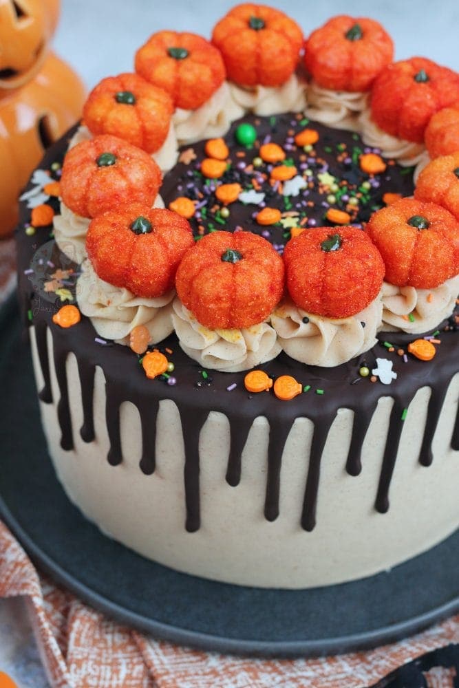 I didn’t feel like the cake needed toooo much decoration as it looks quite showstopper like as it is, however… any drip cake is quite the showstopper. The contrast of a dark chocolate drip, with the bright orange pumpkins, is beautiful!