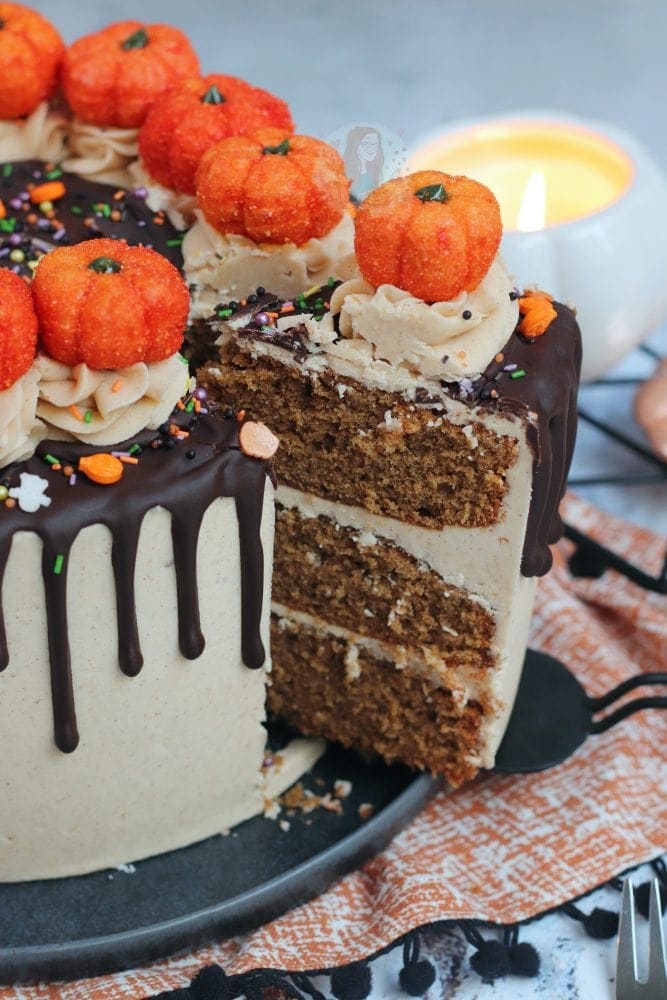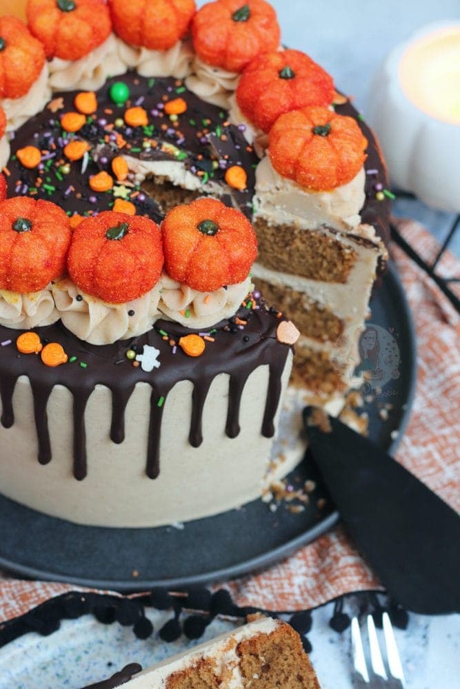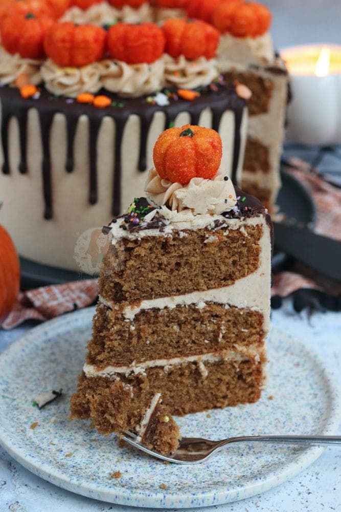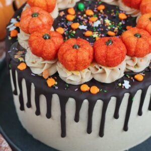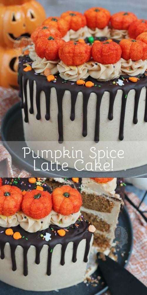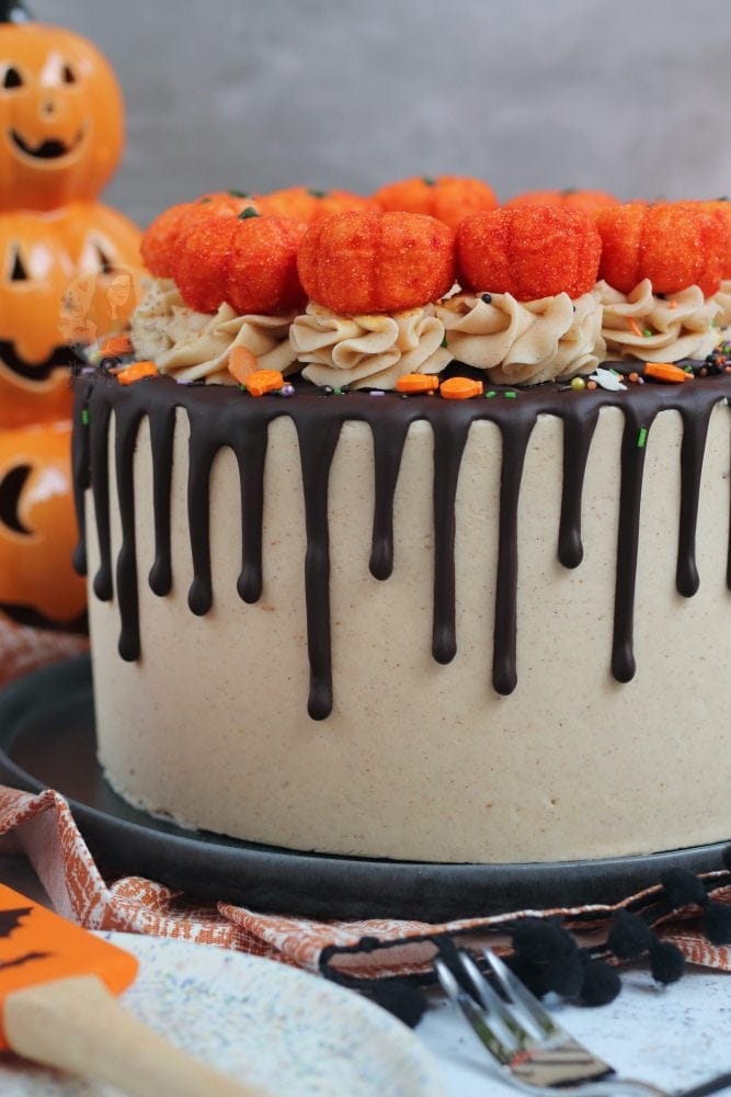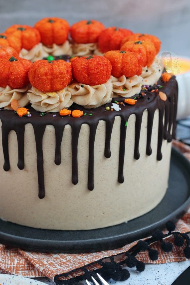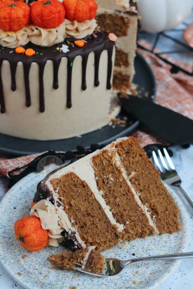 Three layer pumpkin spice latte cake with pumpkin spice coffee sponges, and pumpkin spice buttercream frosting and a chocolate drip!