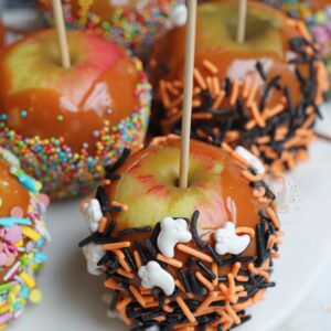 Typically these are actually called ‘candy apples’ rather than toffee apples which is probably where I am going wrong… but am I the only one who prefers calling them toffee apples?! Surely not. But anyway. This recipe only uses SIX ingredients, including the apples, so it’s worth it. If you want to roll them in sprinkles then that’s up to you, I’ve used several different types in the photos, including some really cute Halloween sprinkles, some diddy little sprinkles, and some bright and colourful ones!