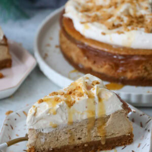 Even though I usually go all out with decorations on a cheesecake, the main part of this beauty is the flavour and texture. I wanted to add something fancy, so simple whipped together a sweetened whipped cream (double cream whipped lightly with some icing sugar for sweetness and stability) and dolloped this on top off the cheesecake. I didn’t do any fancy piping on this occasion, as I wanted to swirl some caramel into it for balance of flavour.