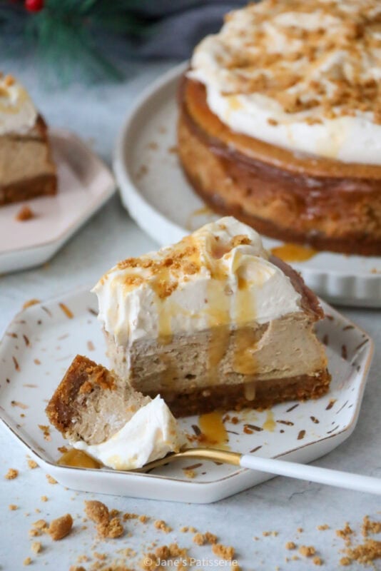 It may seem a bit laborious, but the process is quite easy. You still make a biscuit base, and then you still make a filling, but you then bake, cool and set using the oven and a fridge. The good thing about baked cheesecakes is that whilst they still have to set, but it’s much easier to get a set thanks to the oven. If you are after a no-bake gingerbread cheesecake, you can find the recipe in my second book, Celebrate.