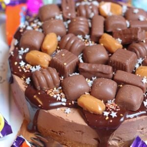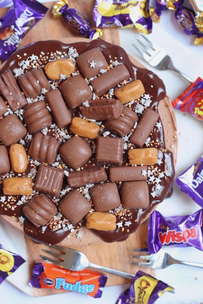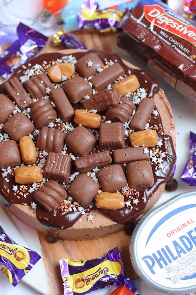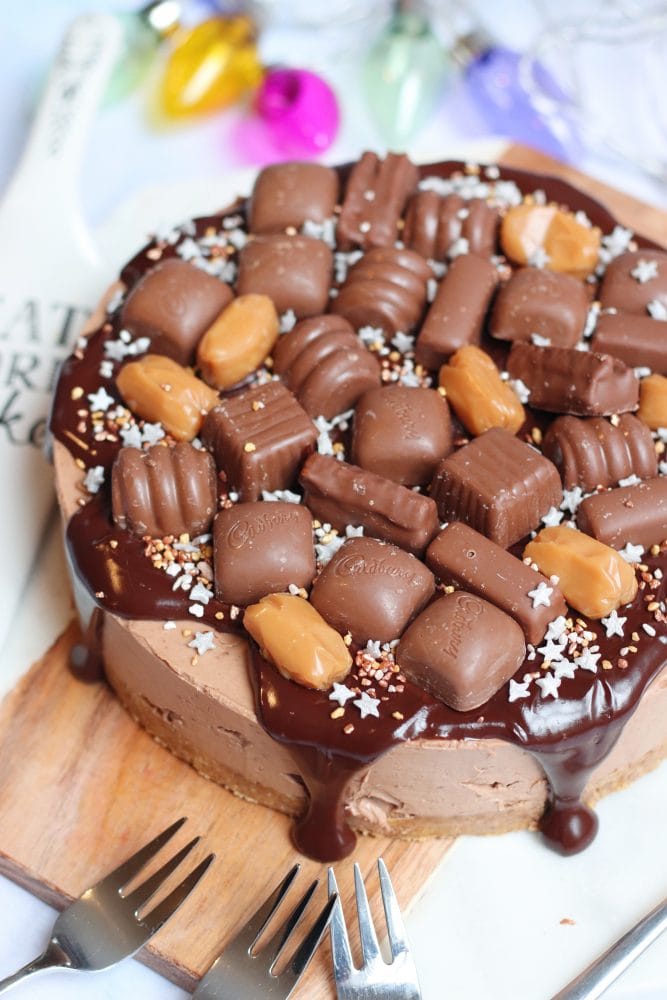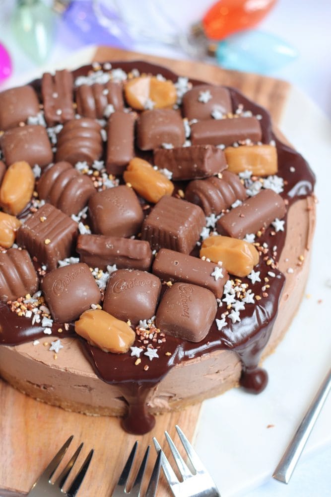 For the decoration of this beauty, I decided to do things a little differently, and do a ganache style ‘drip’ cheesecake, with plenty of Cadbury’s Heroes on top. Of course, with a sprinkling of some cute festive sprinkles. For the filling, I left out the eclairs, as they’d be too solid to cut, but used everything else on the inside. The eclairs went on top, with even more Heroes!