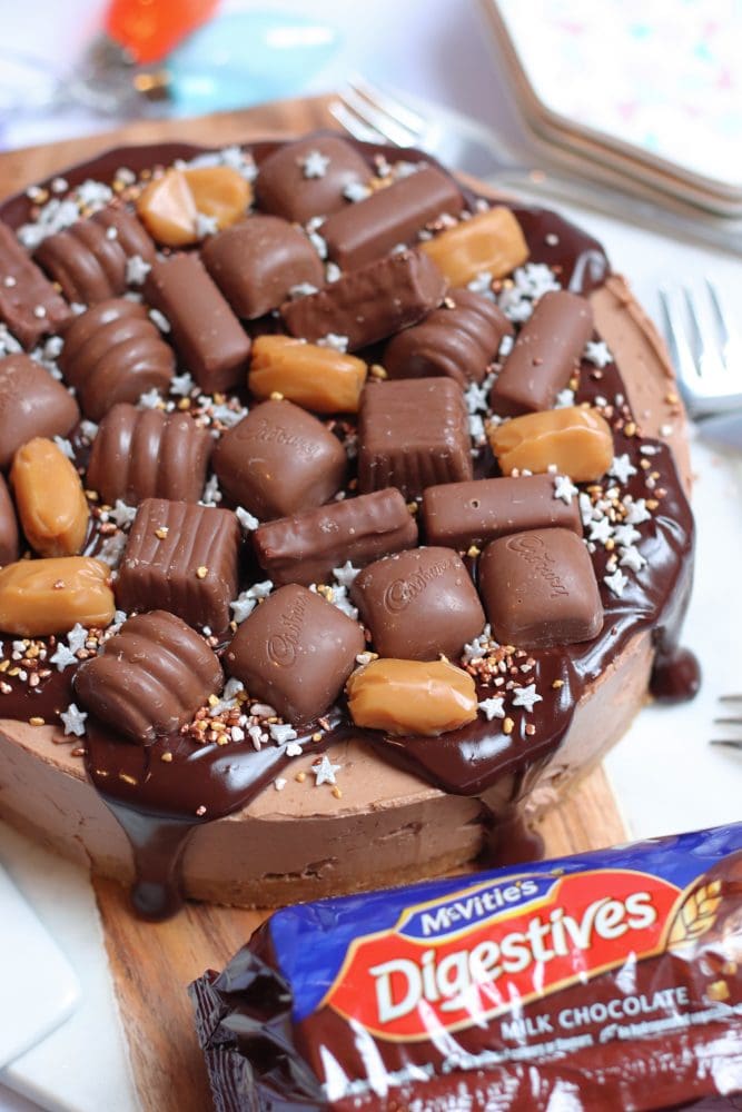 Milk chocolate digestive biscuit base, Cadbury’s Heroes chocolate cheesecake filling, and all the Cadbury’s Heroes goodness on top!