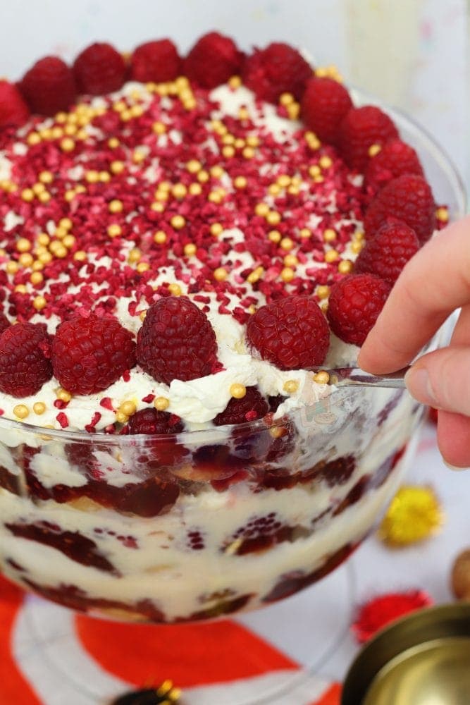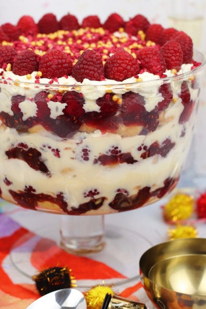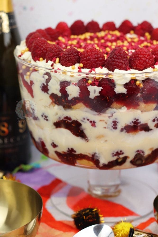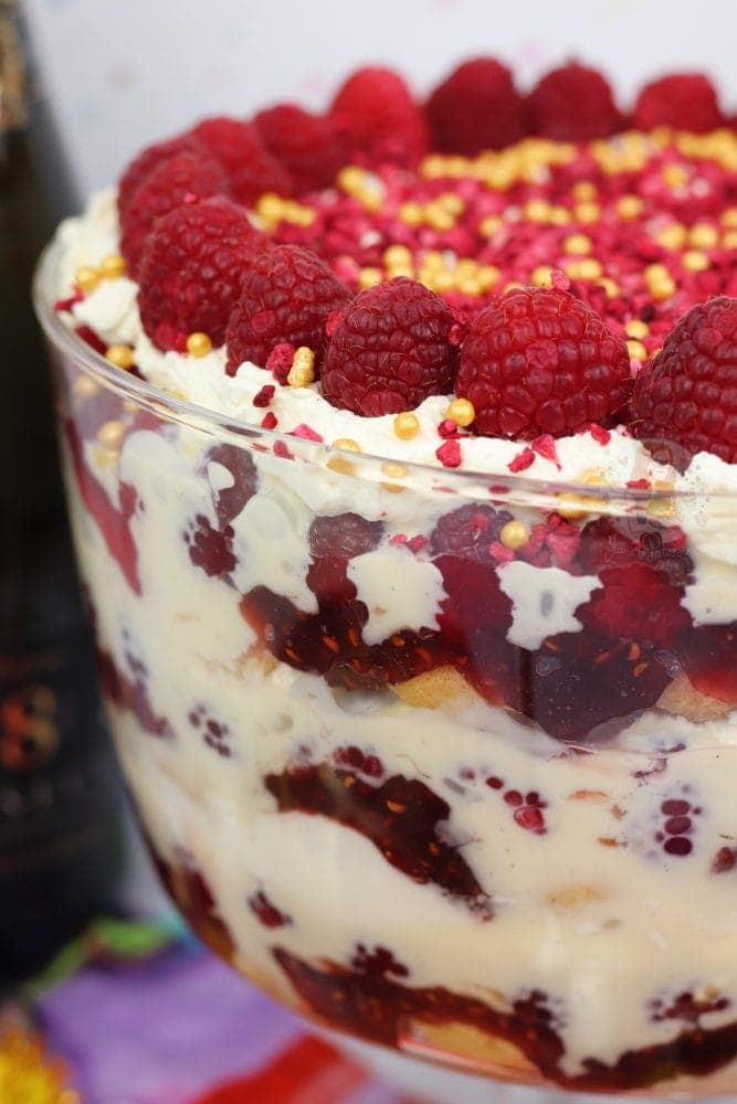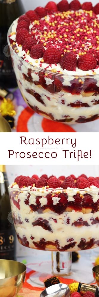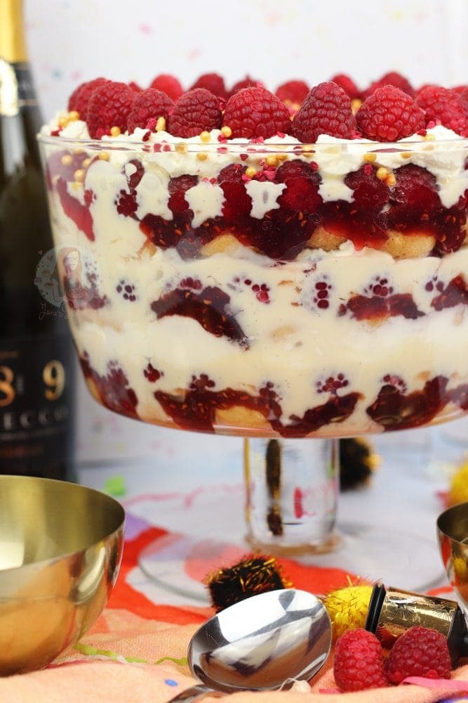 Deliciously boozy raspberry prosecco trifle ideal for New Years or celebrations alike – prosecco, sponge, raspberries, custard and more!