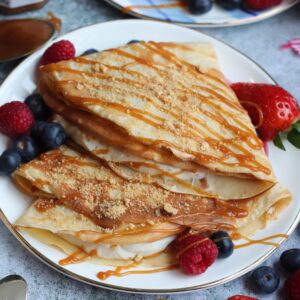 The actual part of this recipe that makes up the majority of it, is just a classic Crêpe recipe, as you can’t mess with something so iconic. This recipe is very simple and works well with sweet or savoury fillings, and there’s only technically three ingredients! Top that with ALL of the salted caramel, you have one of THE most incredible ‘bakes’ for Pancake Day this year. For a completely different style and flavour – check out my chocolate chip pancakes!
