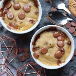 - I use two ramekins for these - which are a decent size but it makes the cookie look 'full'. You can use any mug that is microwave safe but the cookie doesn't really rise so beware of that!