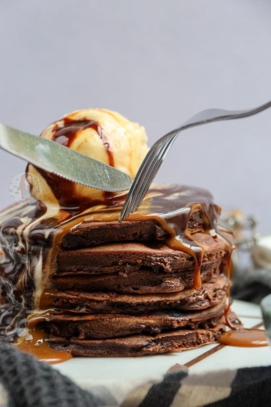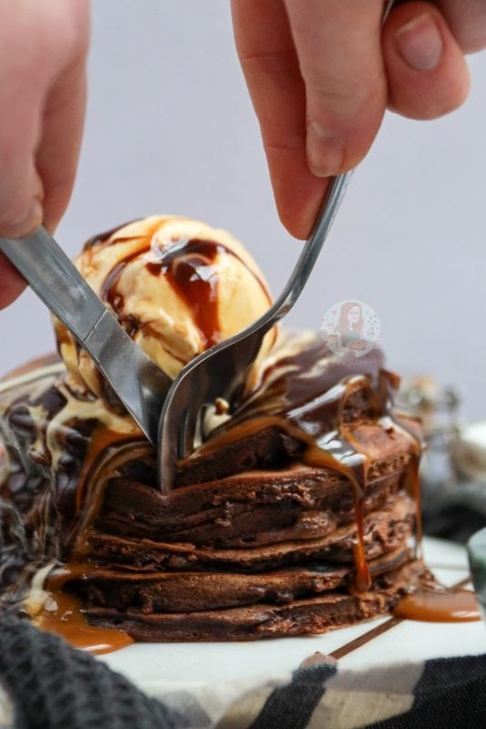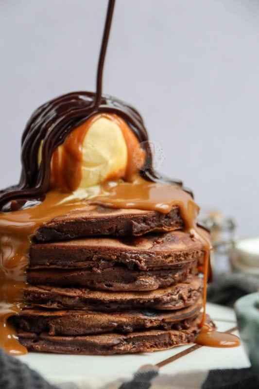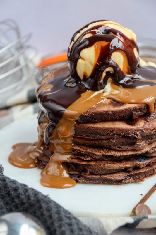 Top these with an ice cream of your choice, and a drizzle of chocolate sauce… or even caramel sauce… and you have one of the best and most ‘food porn’ like pancake stacks. You can obviously go a little more overboard like places such as Creams Cafe so, and really make a stack out of them. Add on Kinder bars, chocolate orange segments, whipped cream, sprinkles and so on… but then that can get a little much.