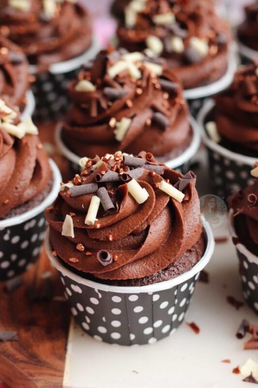 For the cupcake sponges, you need to use dark chocolate in the cake sponge as this is part of what makes it so fudgey, so PLEASE don’t switch it to milk chocolate. Don’t worry if you don’t like dark chocolate, they don’t taste bitter – they taste like a rich and delicious chocolate cake.